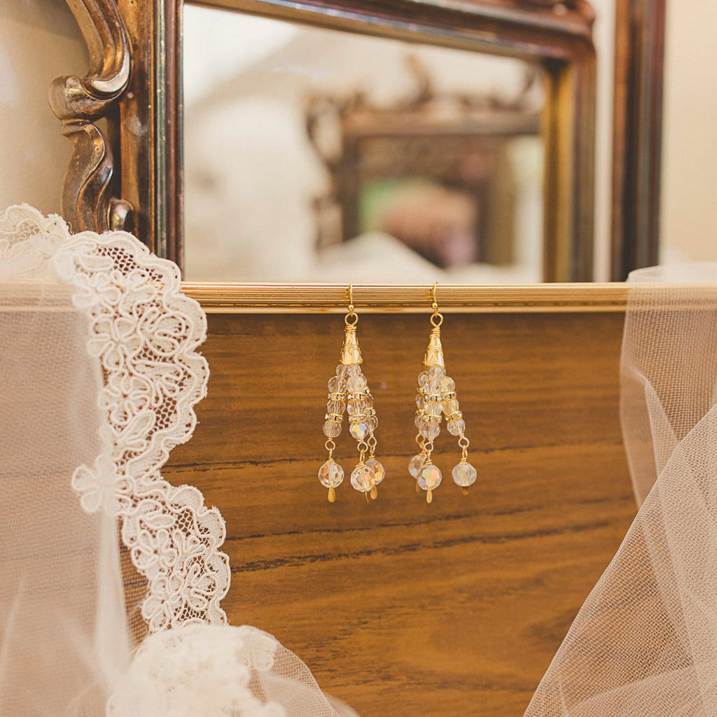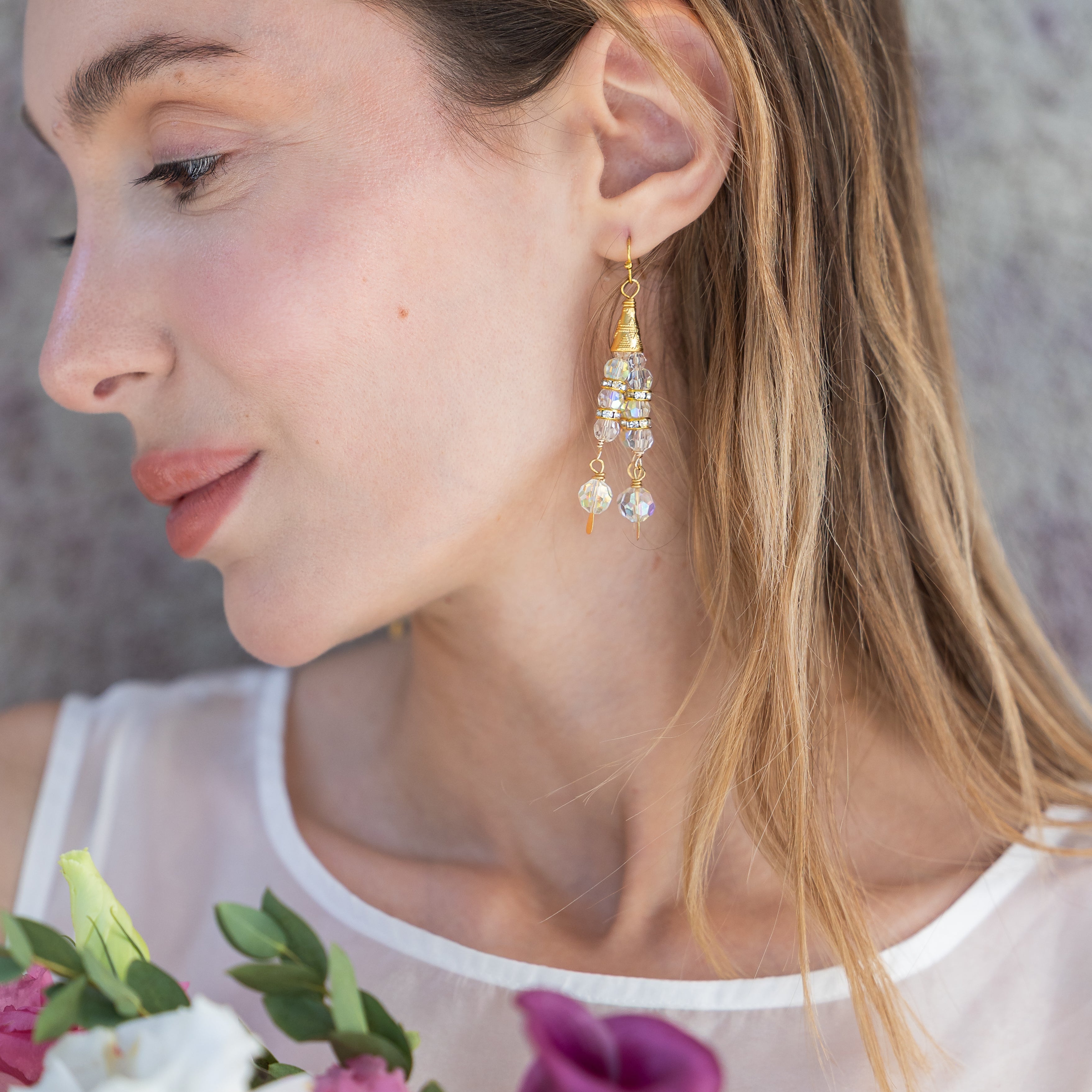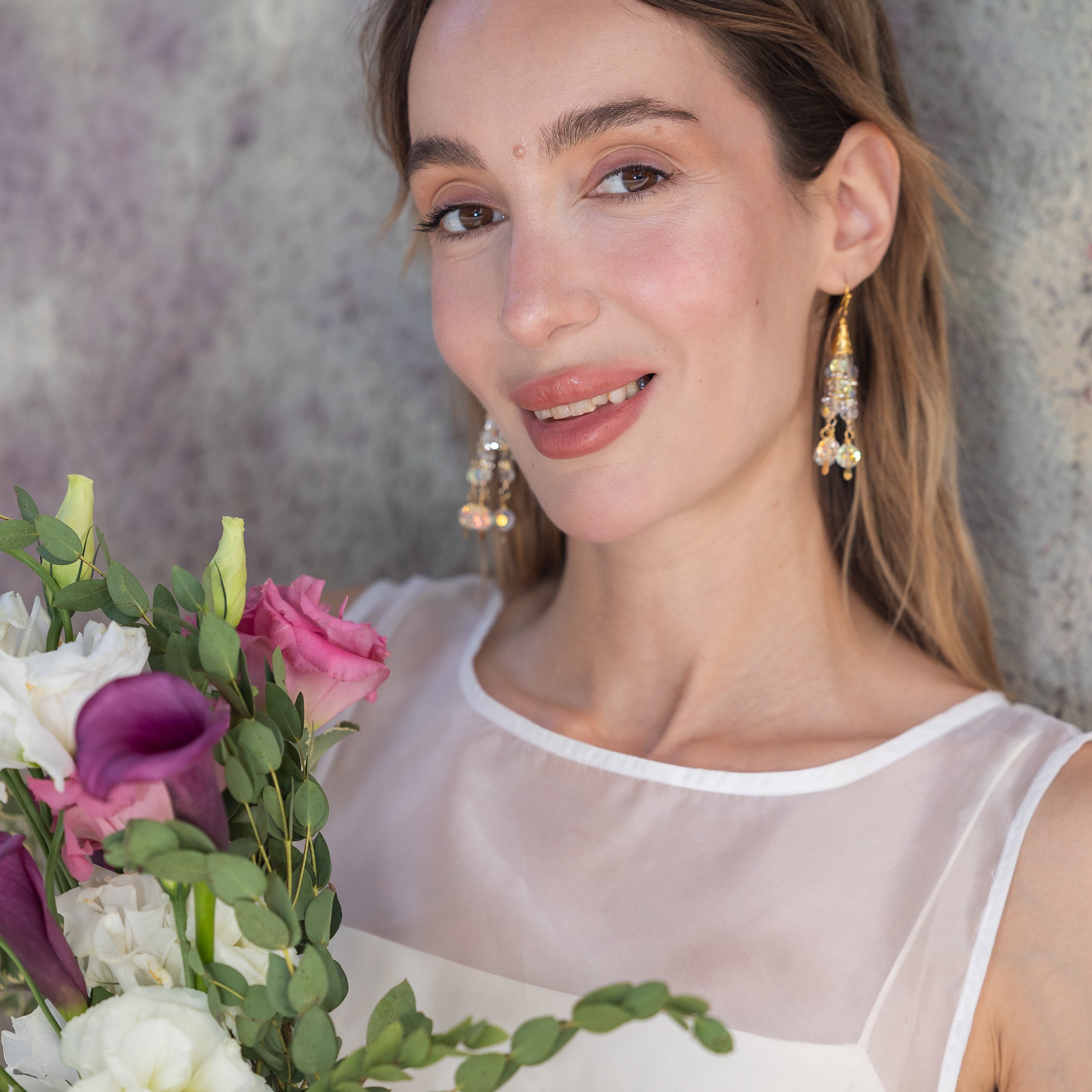Elegant, lightweight chandeliers crafted with golden caps and shimmering faceted crystals. These vintage-inspired drops catch the light beautifully and add a romantic glow to bridal looks, evening wear, or any moment that calls for timeless sparkle.