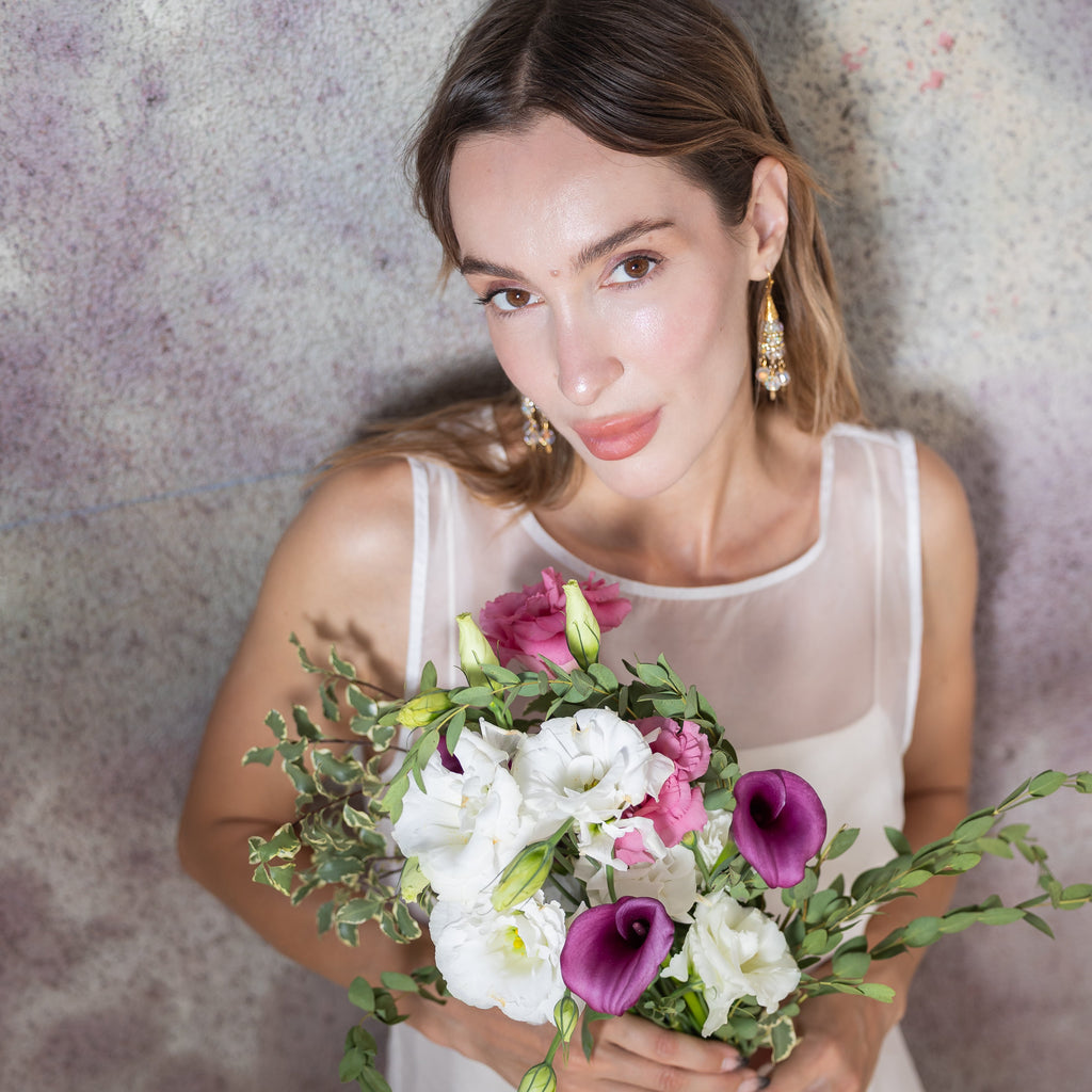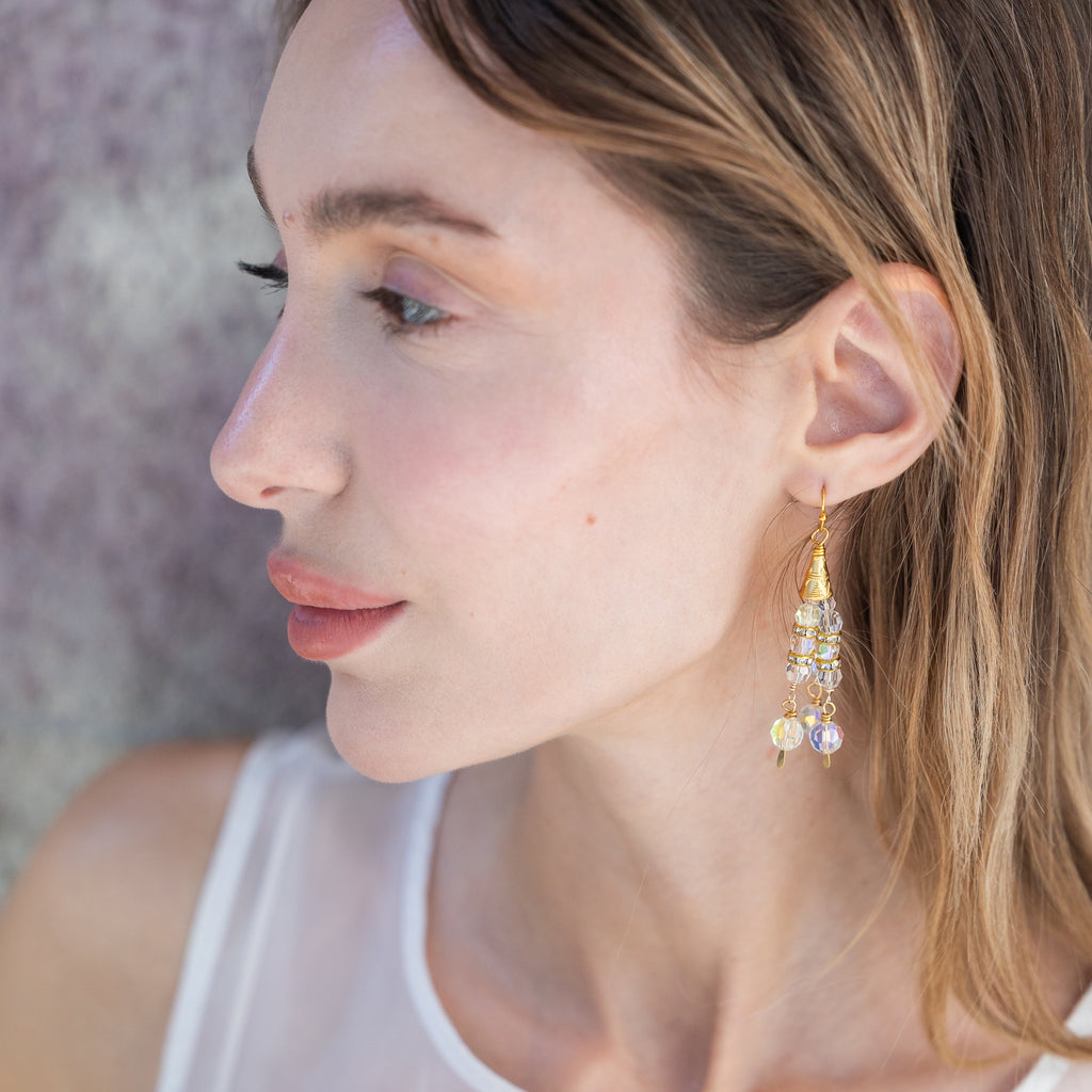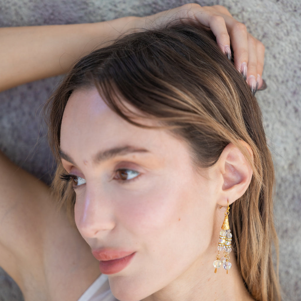 Elegant, lightweight chandeliers crafted with golden caps and shimmering faceted crystals. These vintage-inspired drops catch the light beautifully and add a romantic glow to bridal looks, evening wear, or any moment that calls for timeless sparkle.
