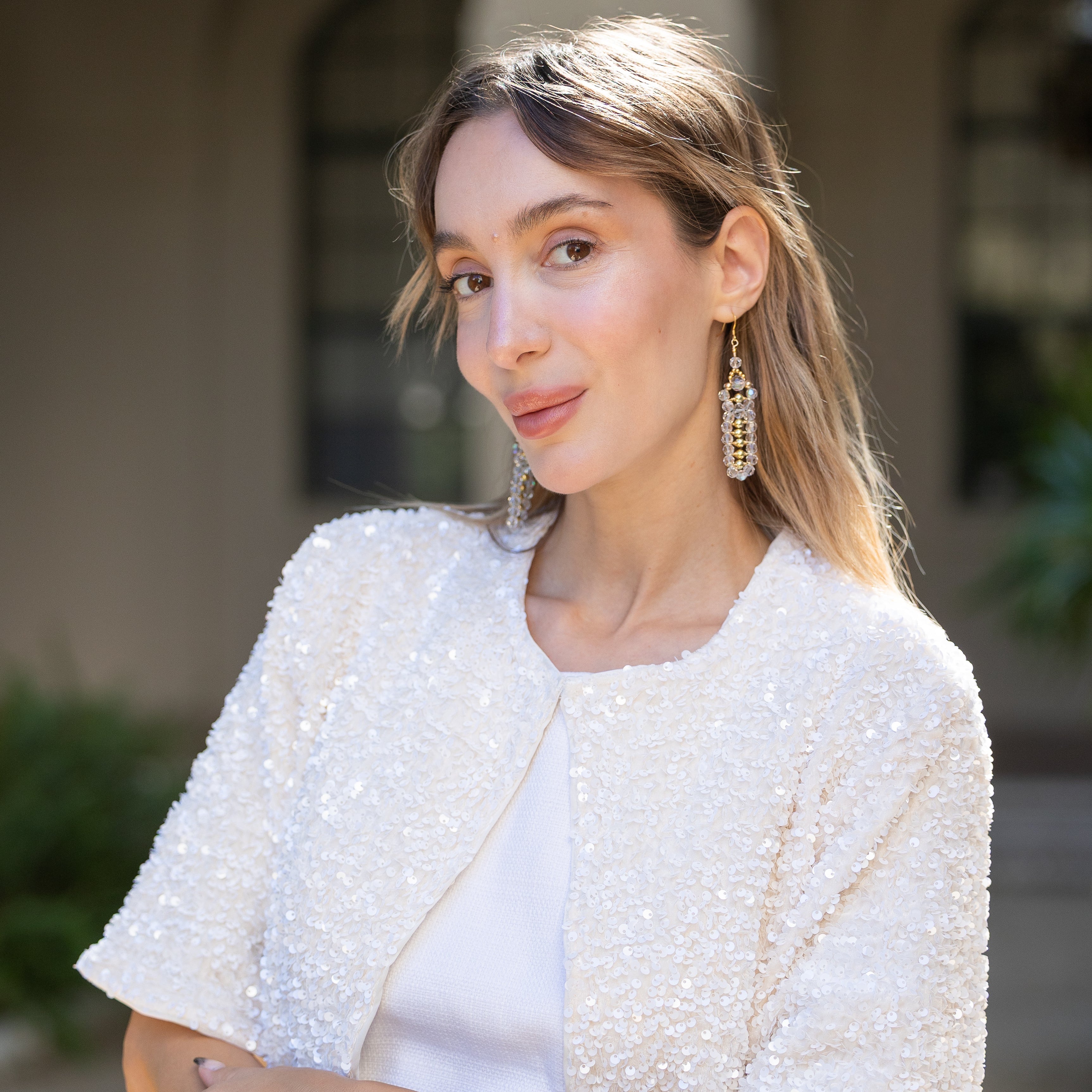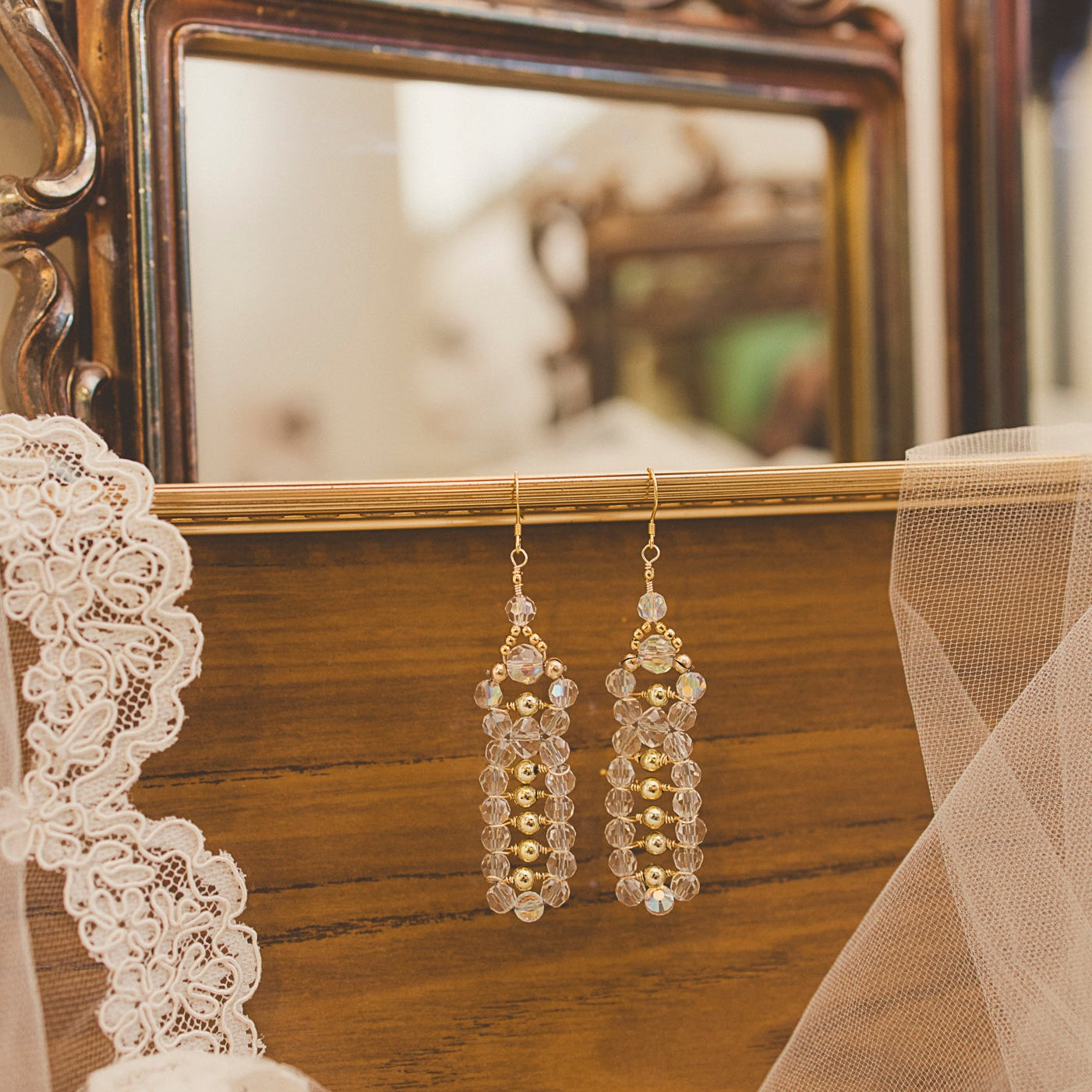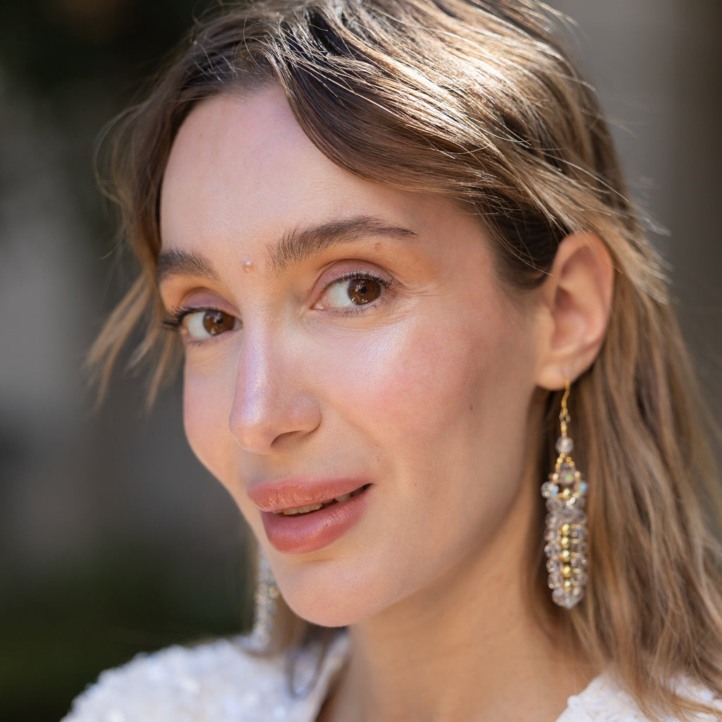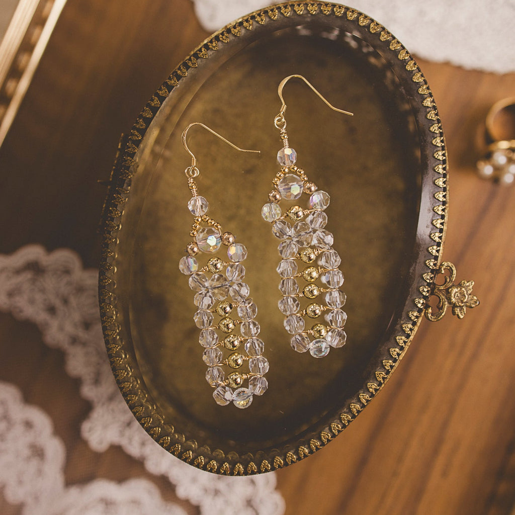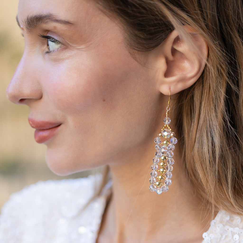 A refined column of faceted crystals and gold-toned beads creates a sleek, luminous drop that feels both vintage and modern. Lightweight, sparkly, and elegant — the perfect elevated accessory for brides, evening wear, or any outfit that needs a touch of polished glamour.