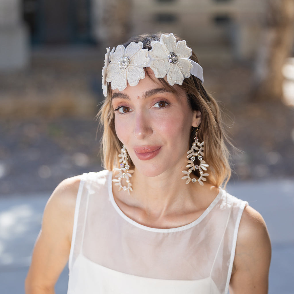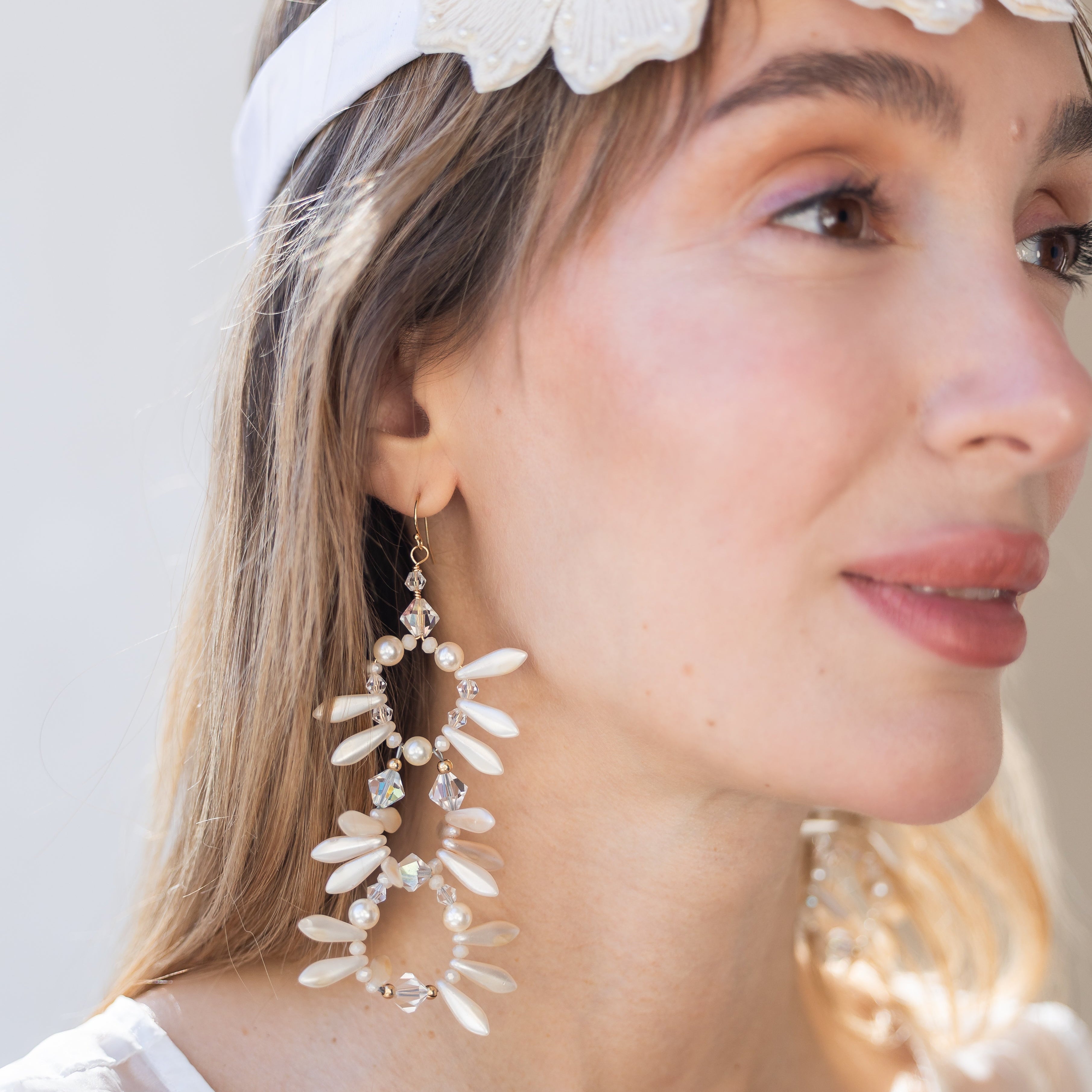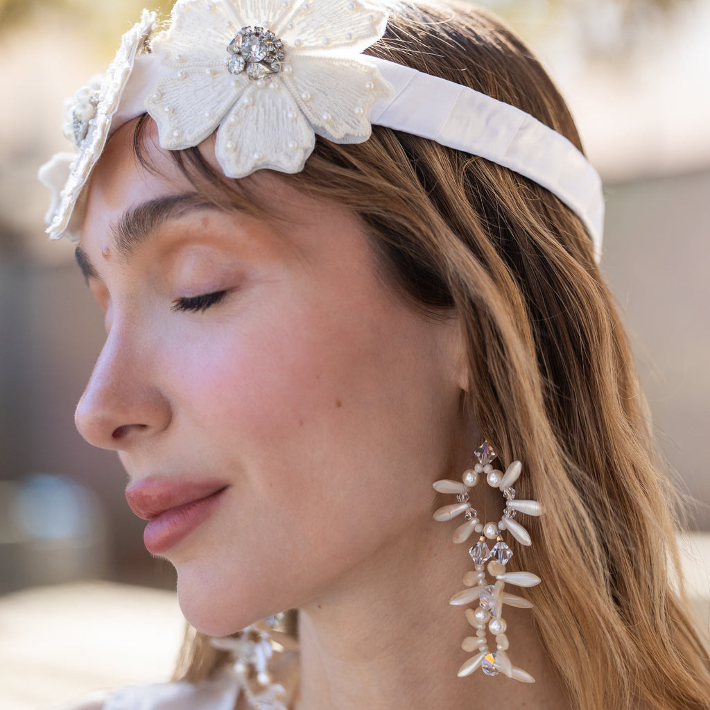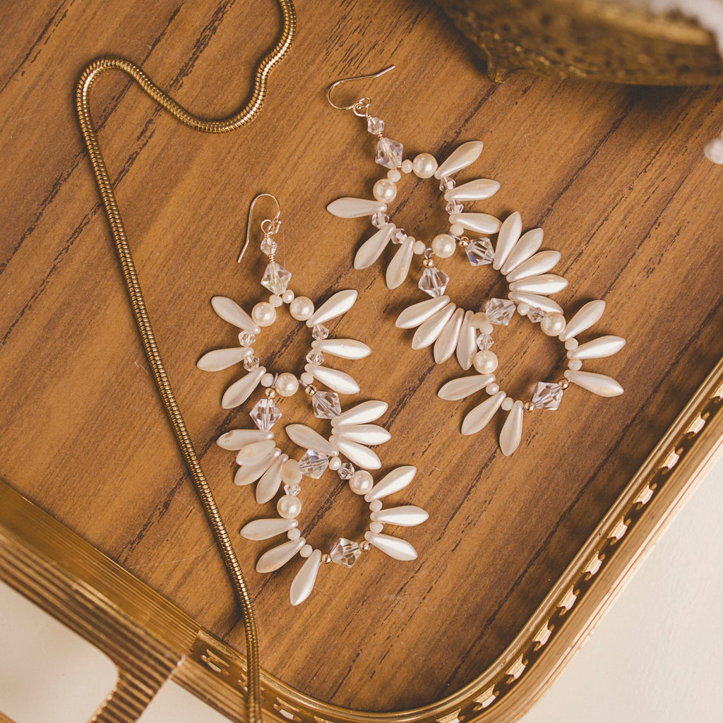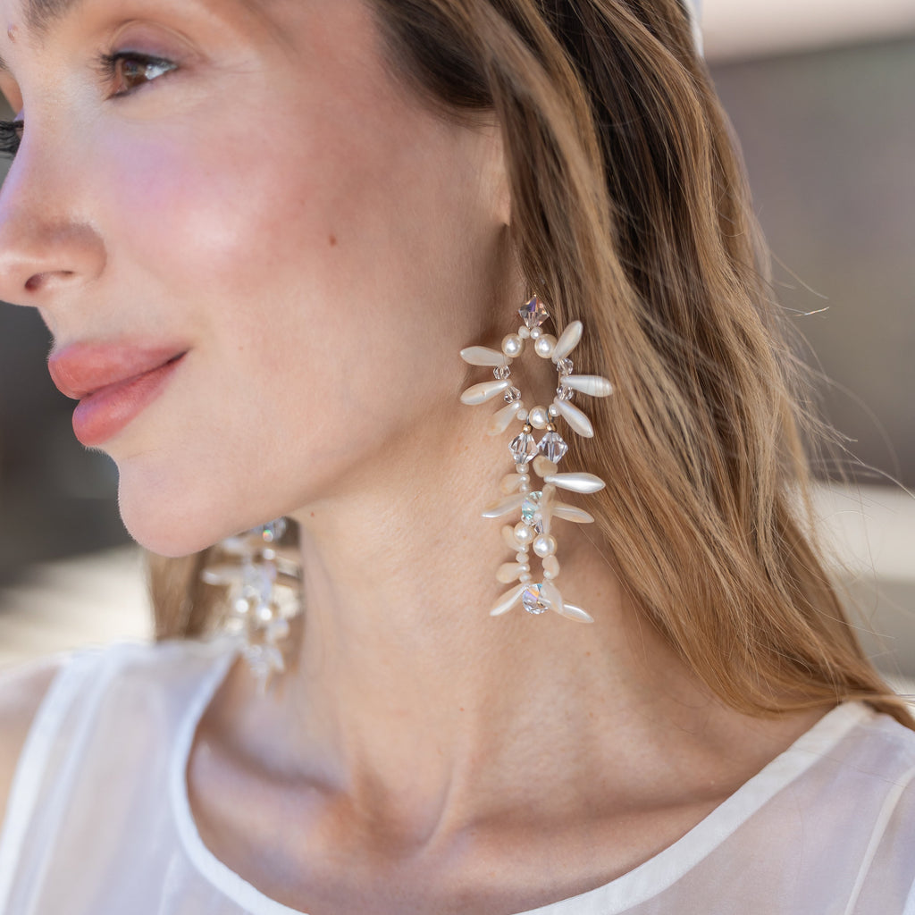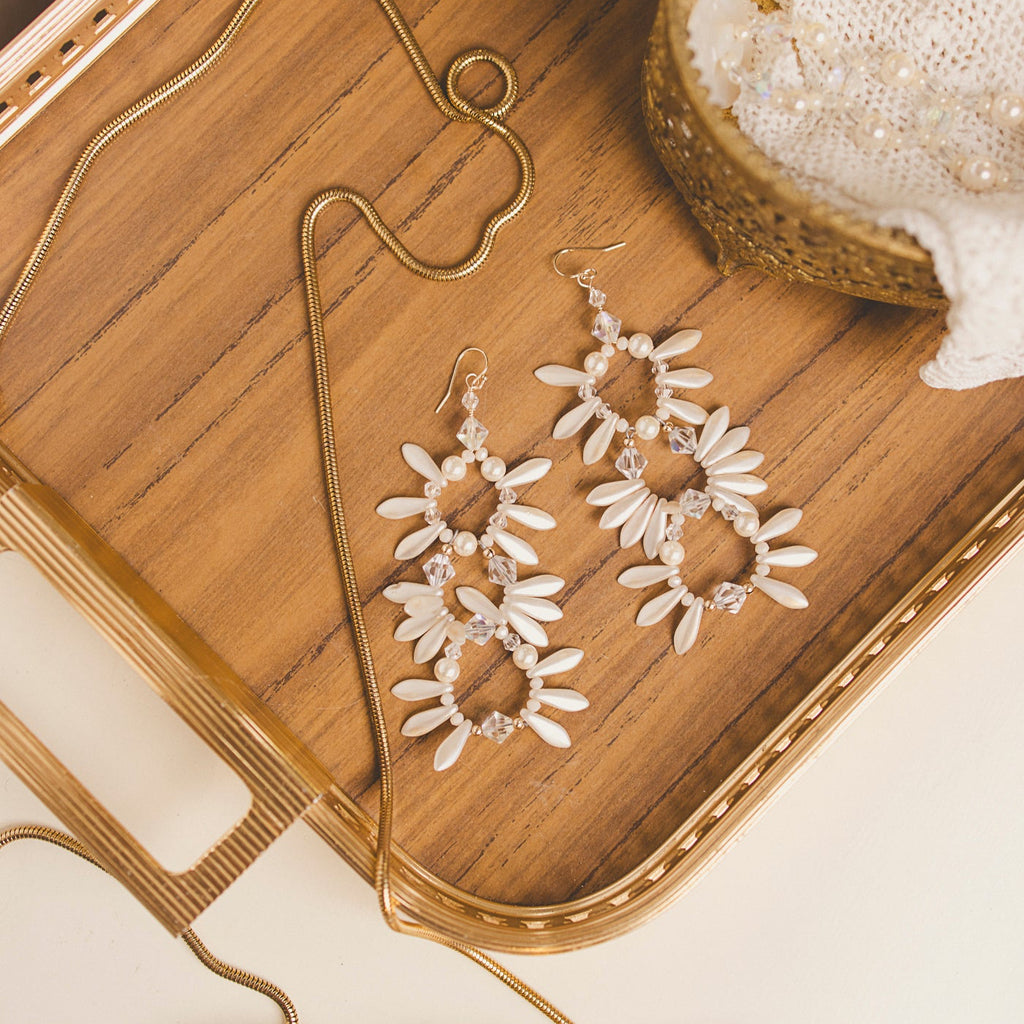 Delicate pearlescent petals and faceted crystals come together in a cascading triple-drop design that feels timeless, feminine, and effortlessly luxe. Hand-crafted for brides, parties, and anyone craving that soft, romantic glow in their jewelry.