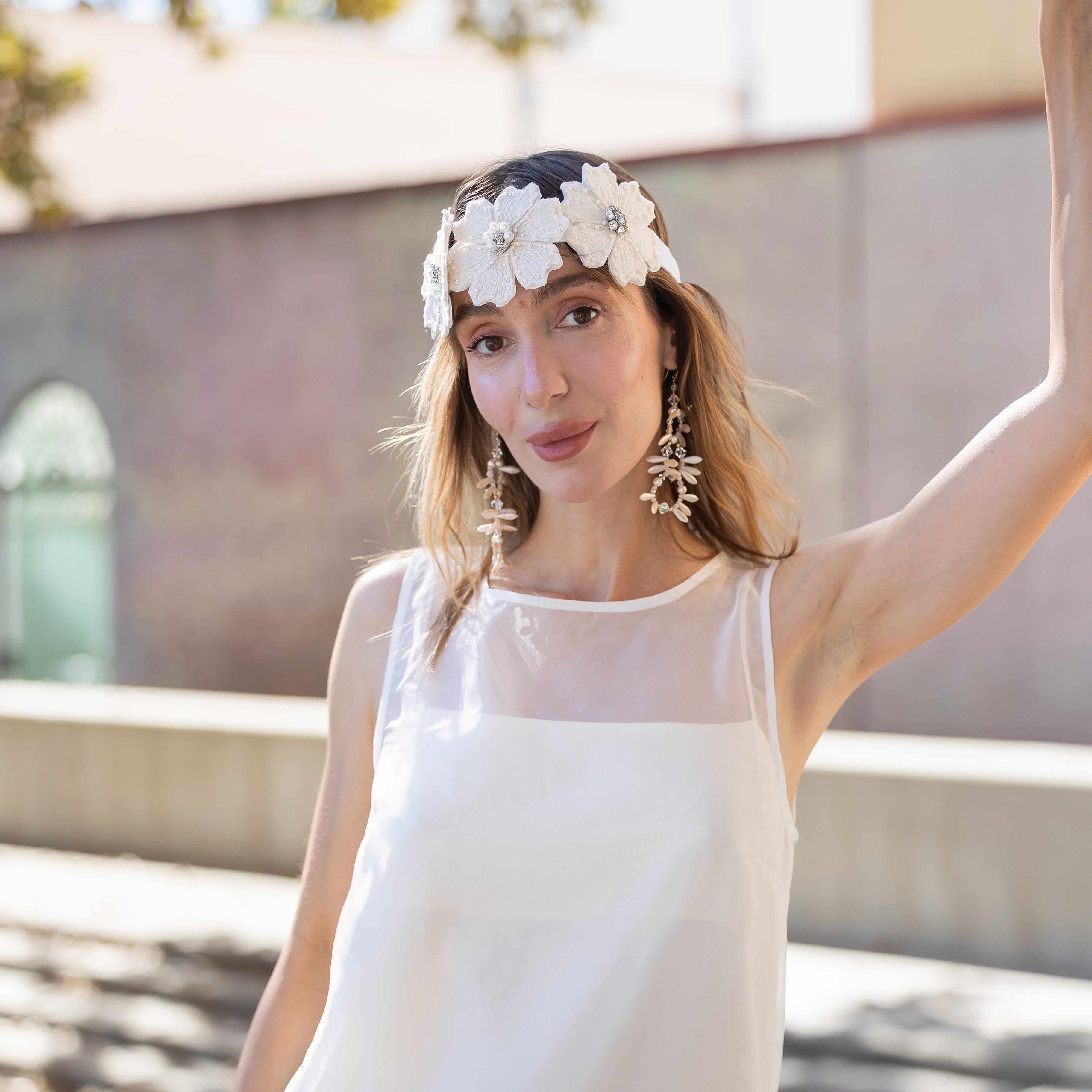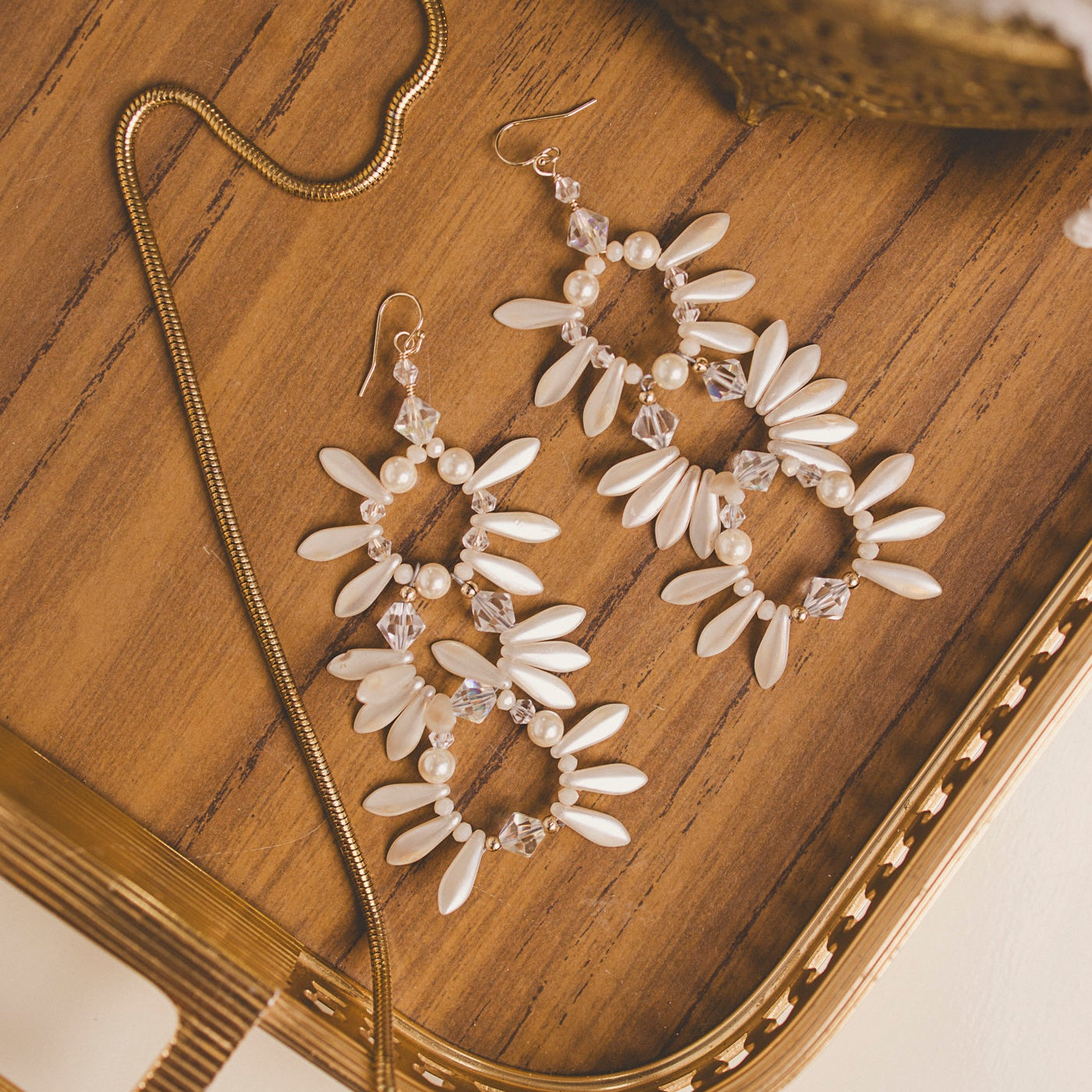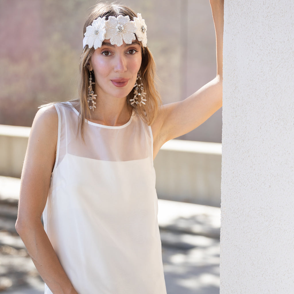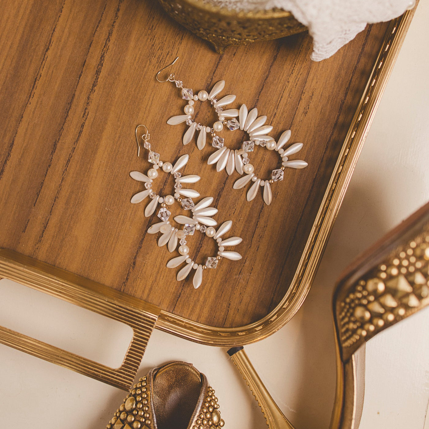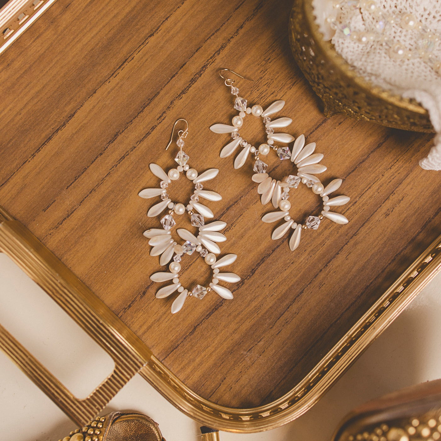 Delicate pearlescent petals and faceted crystals come together in a cascading triple-drop design that feels timeless, feminine, and effortlessly luxe. Hand-crafted for brides, parties, and anyone craving that soft, romantic glow in their jewelry.