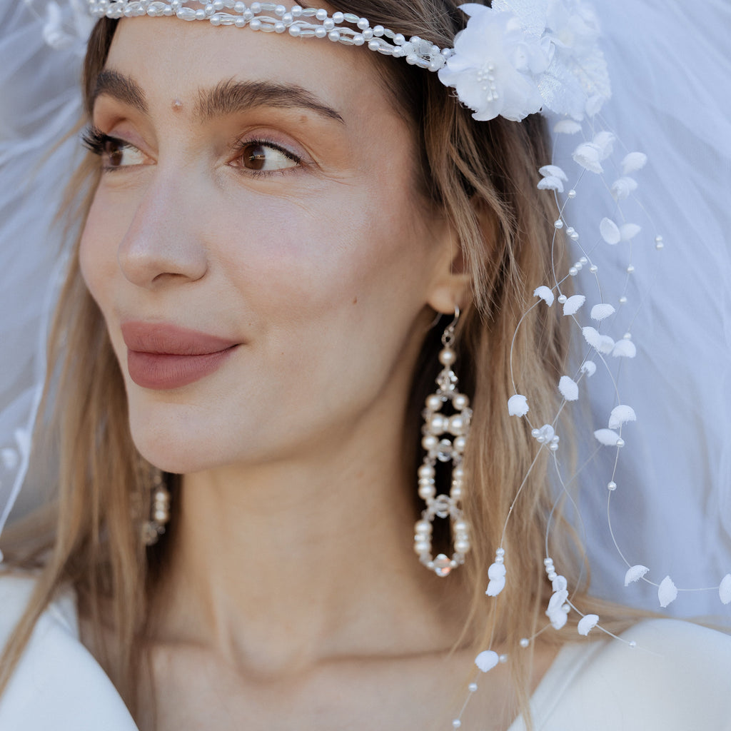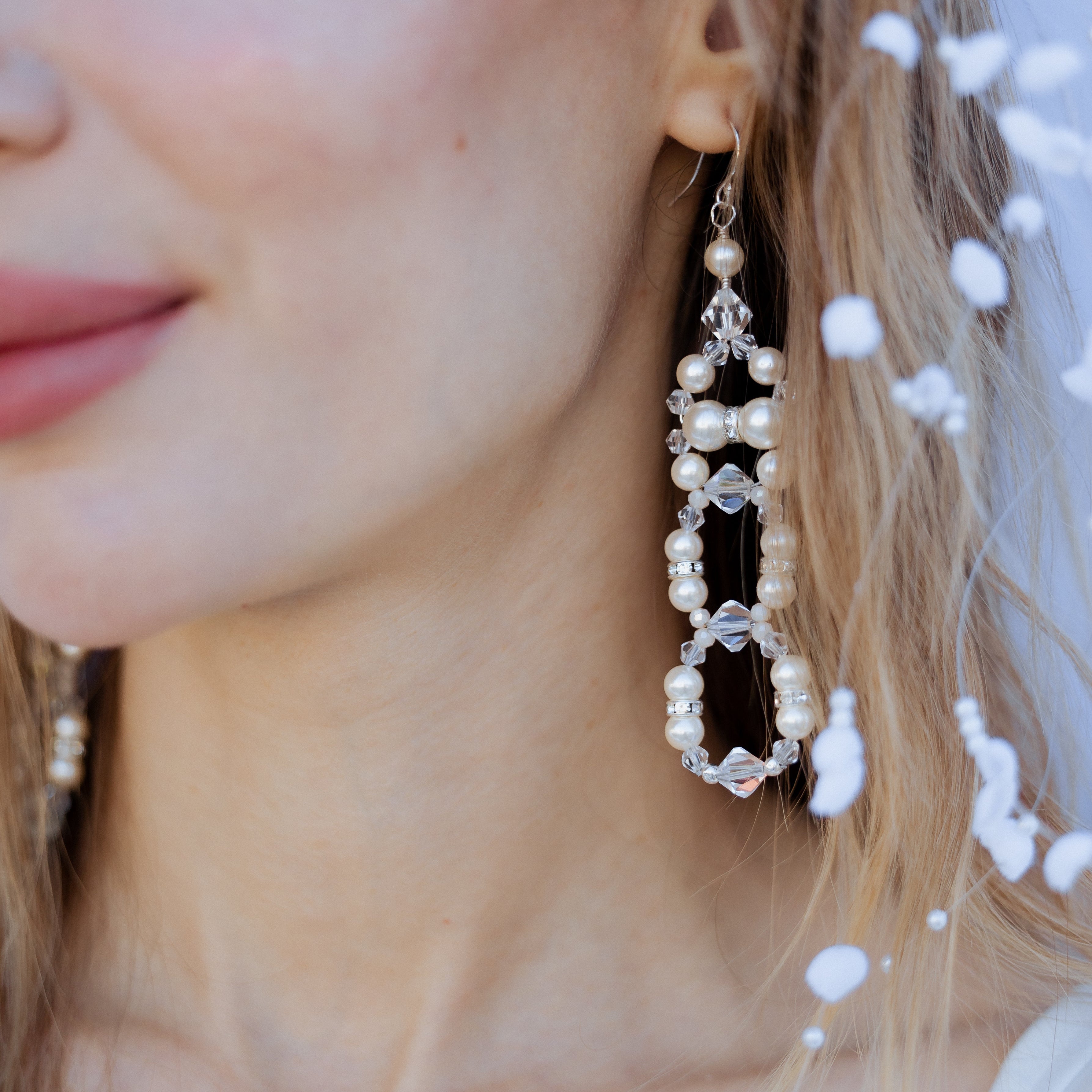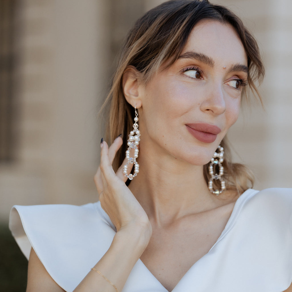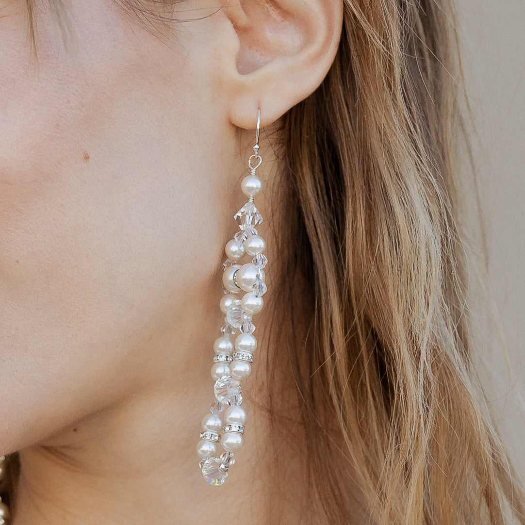 Elegant, elongated cascades of pearls and faceted crystals create a luminous statement made for modern brides. Lightweight, airy, and hand-assembled for a romantic shimmer that photographs beautifully from every angle. Perfect for ceremonies, receptions, and dreamy editorial moments.