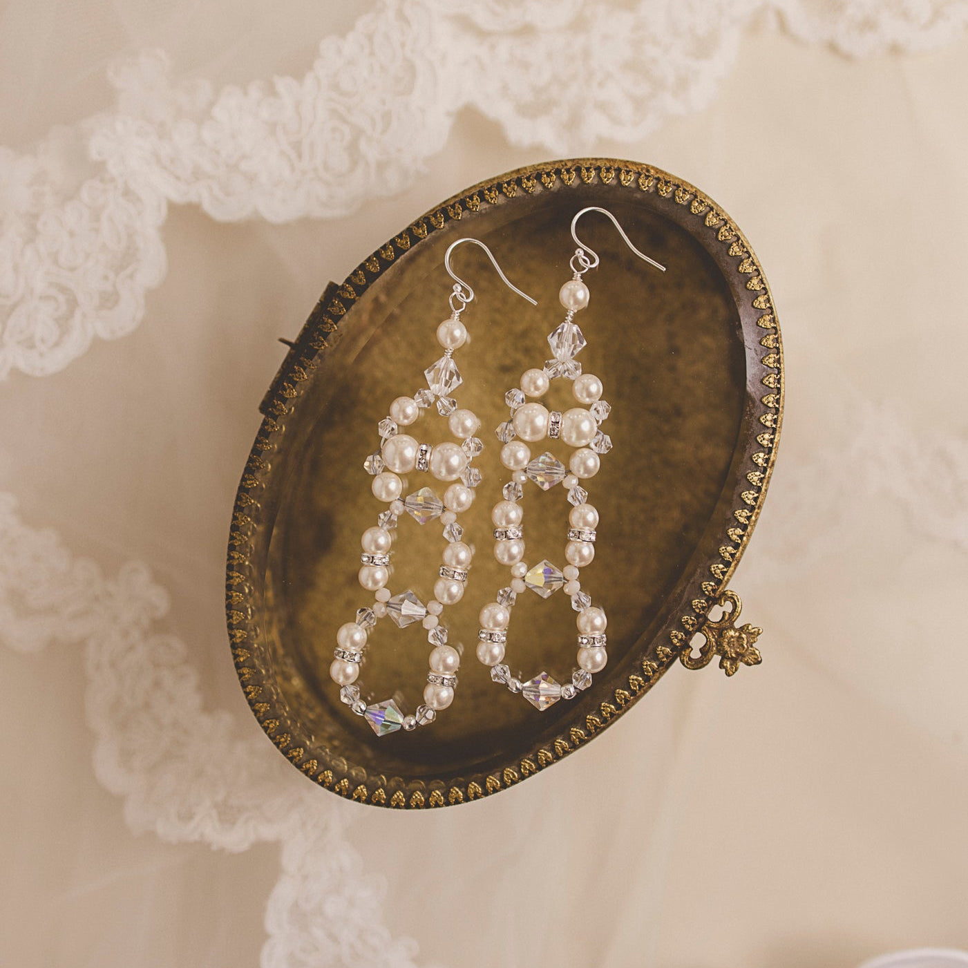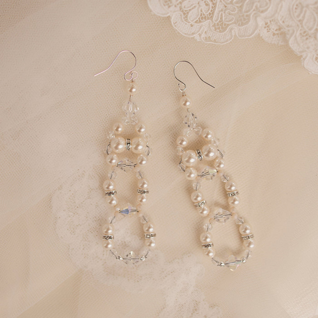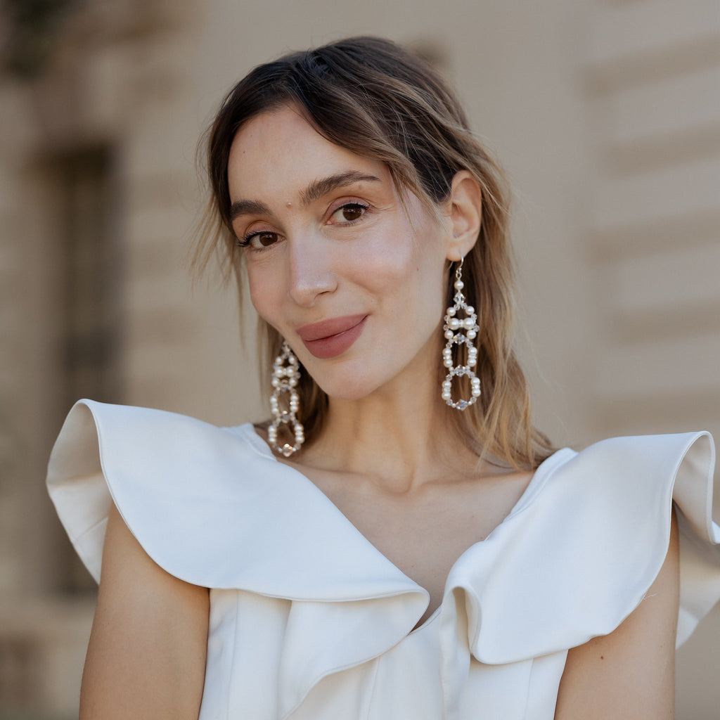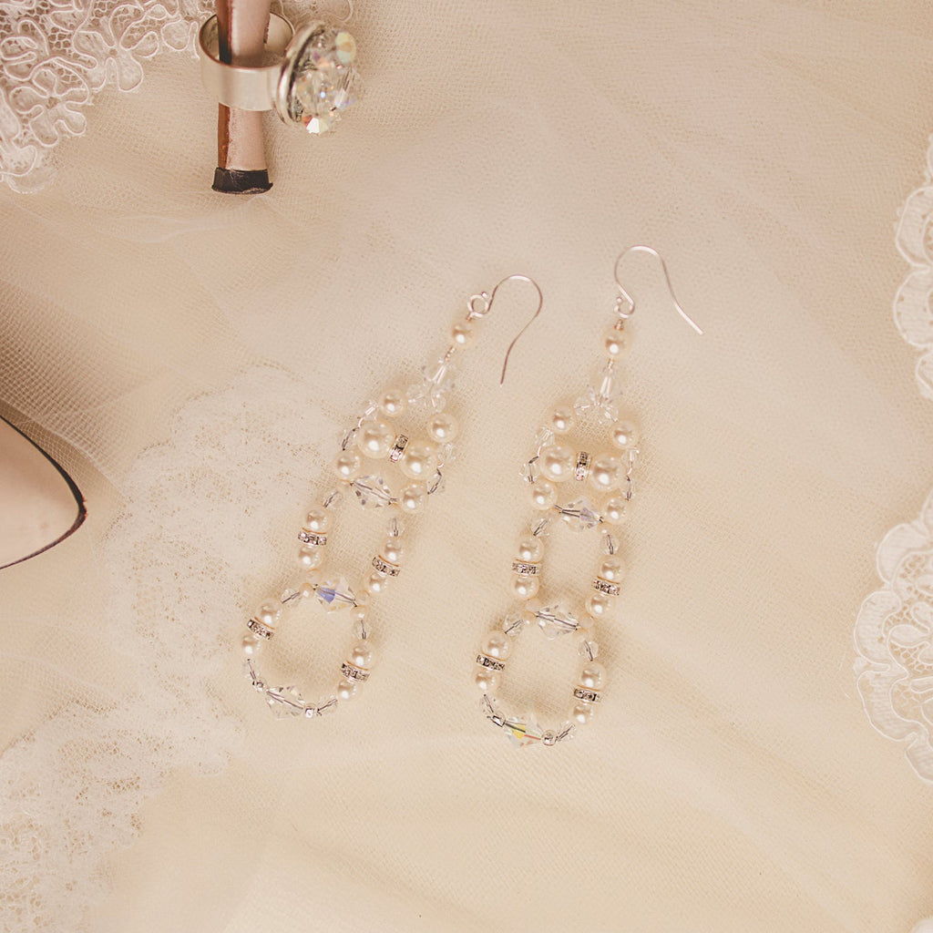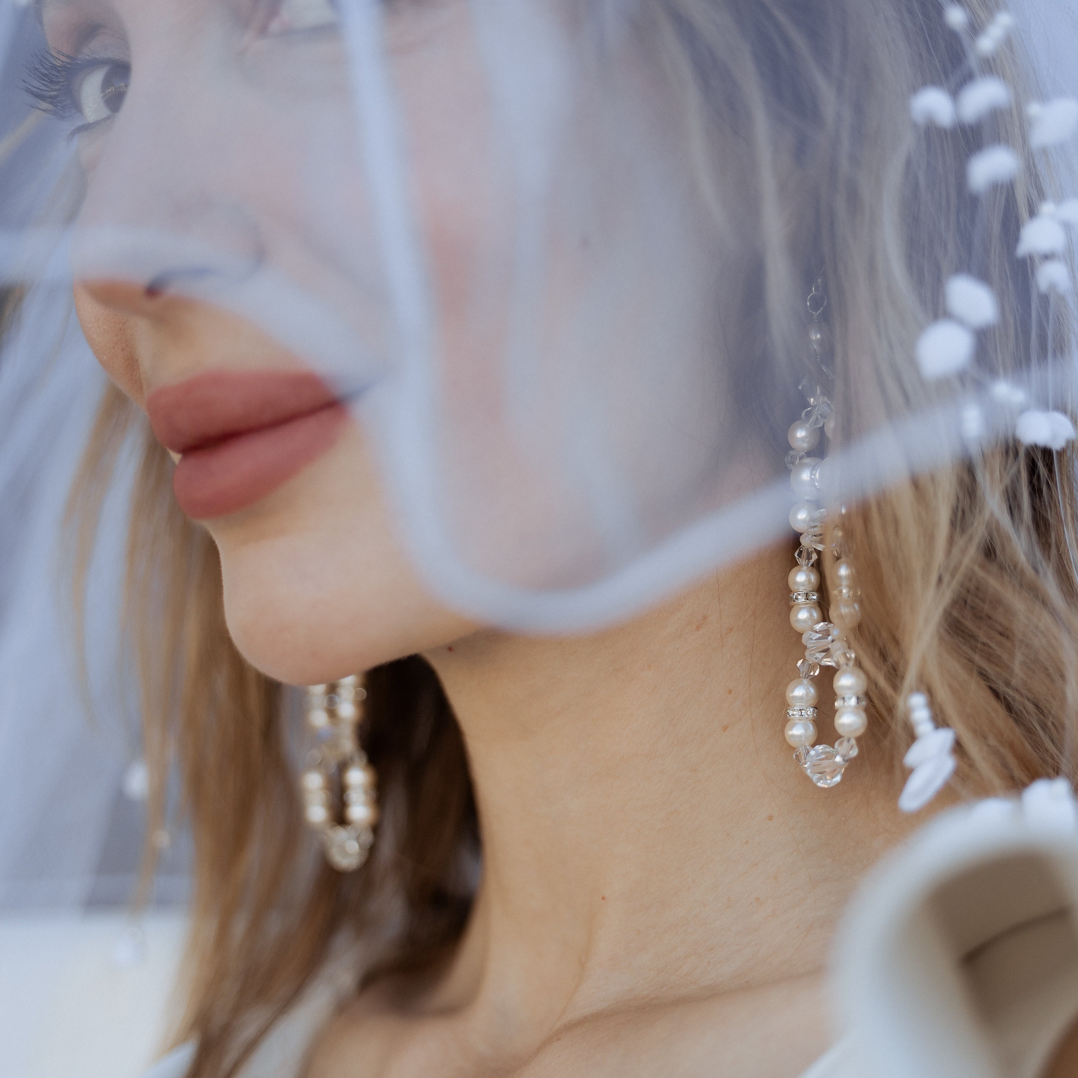 Elegant, elongated cascades of pearls and faceted crystals create a luminous statement made for modern brides. Lightweight, airy, and hand-assembled for a romantic shimmer that photographs beautifully from every angle. Perfect for ceremonies, receptions, and dreamy editorial moments.