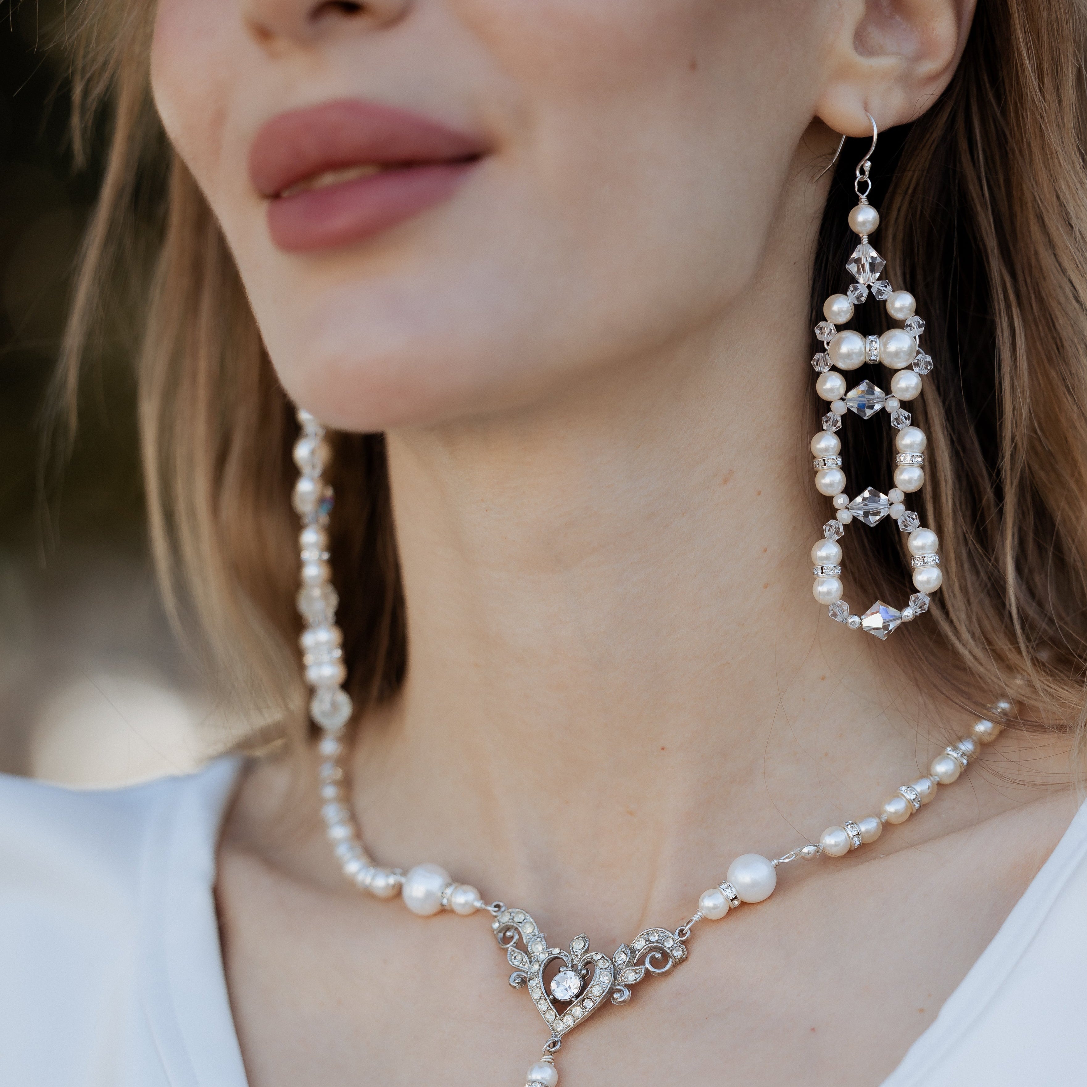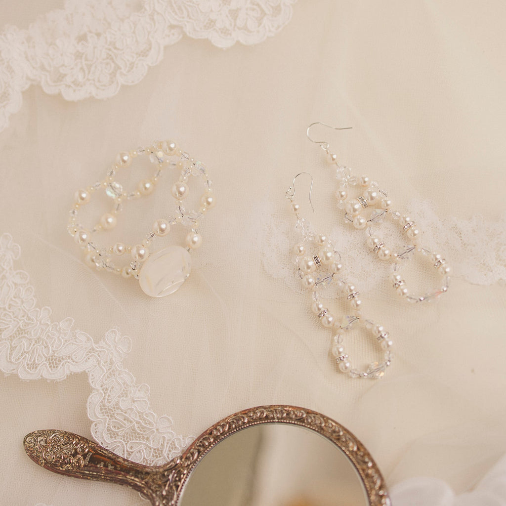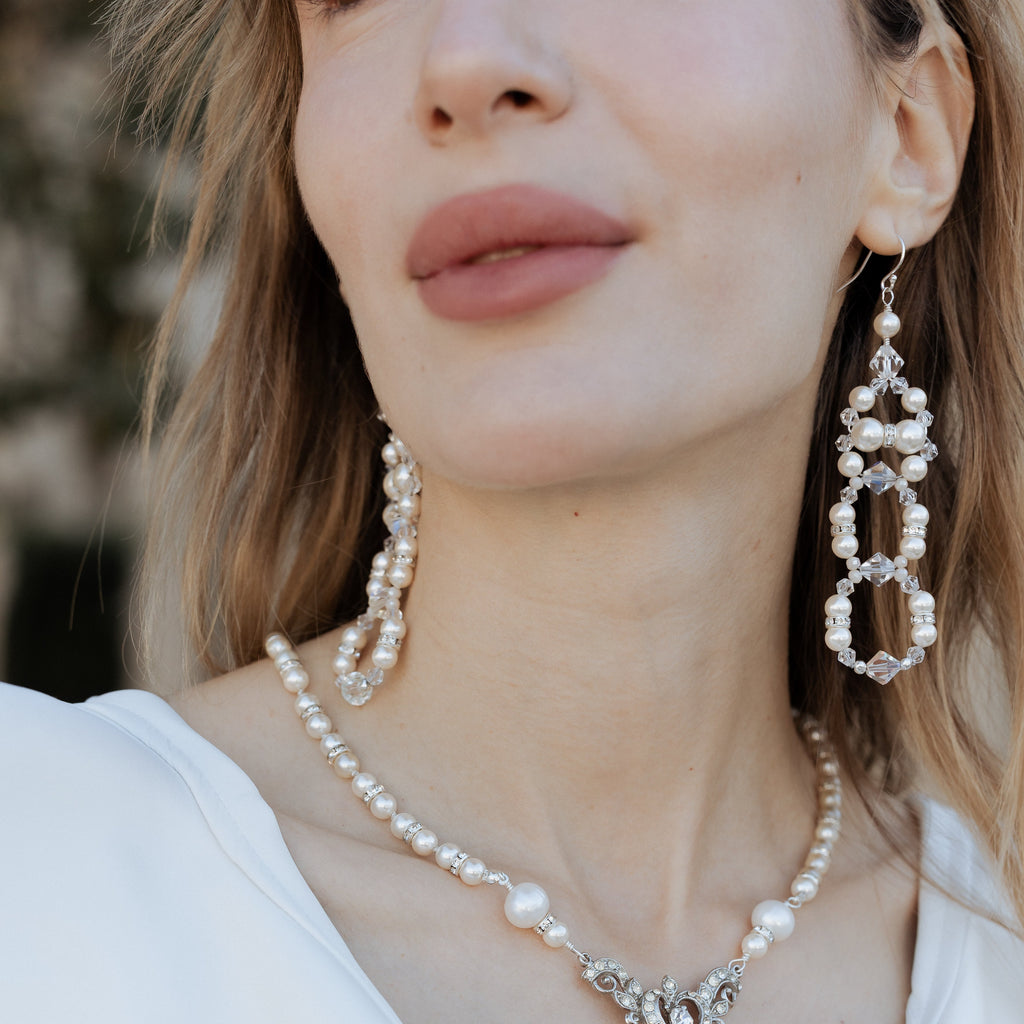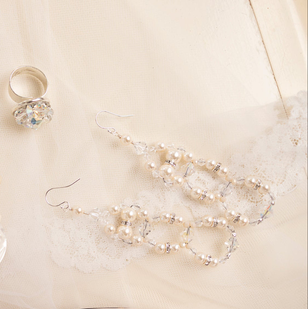 Elegant, elongated cascades of pearls and faceted crystals create a luminous statement made for modern brides. Lightweight, airy, and hand-assembled for a romantic shimmer that photographs beautifully from every angle. Perfect for ceremonies, receptions, and dreamy editorial moments.