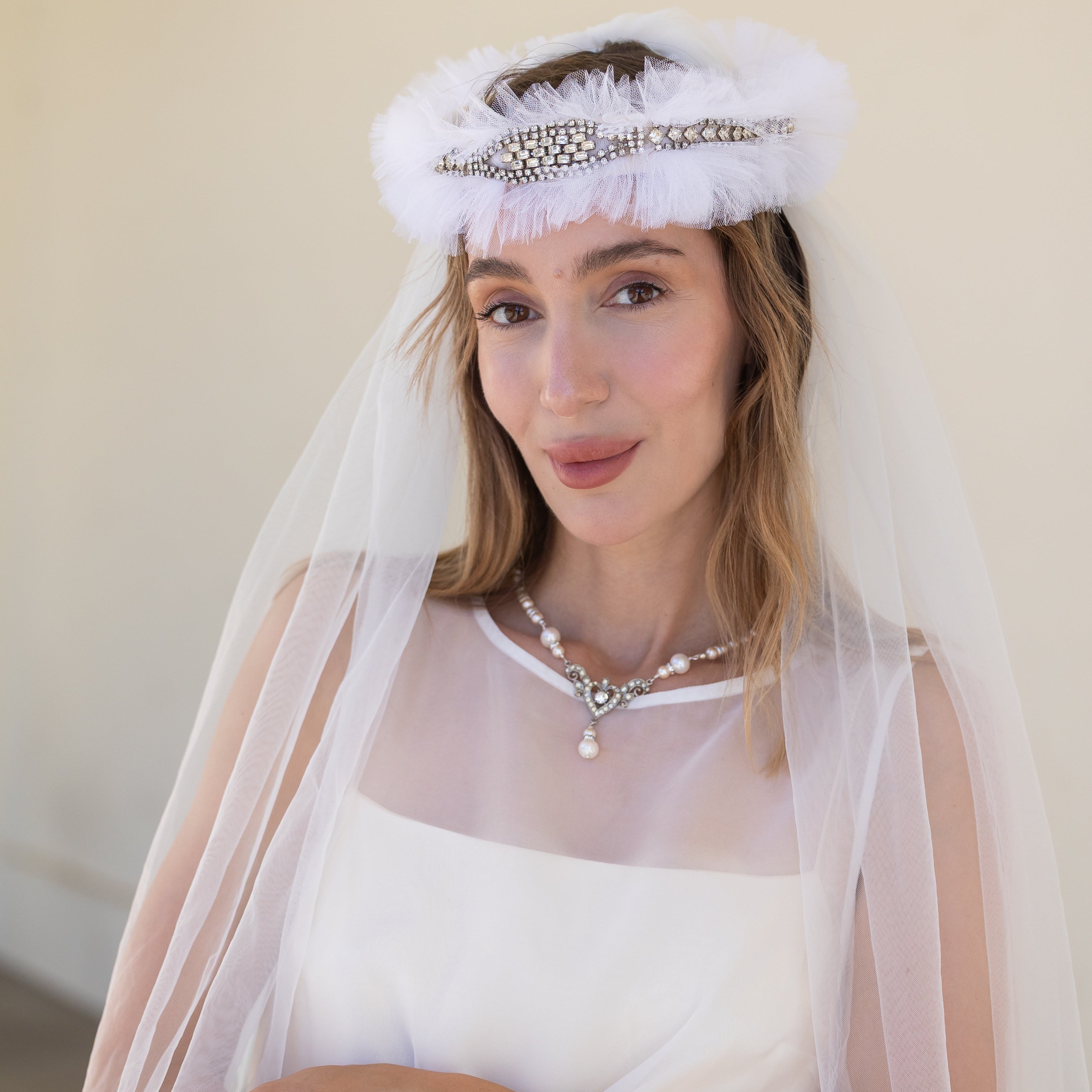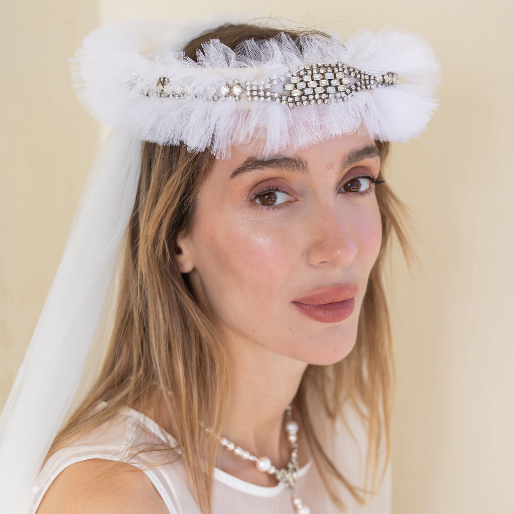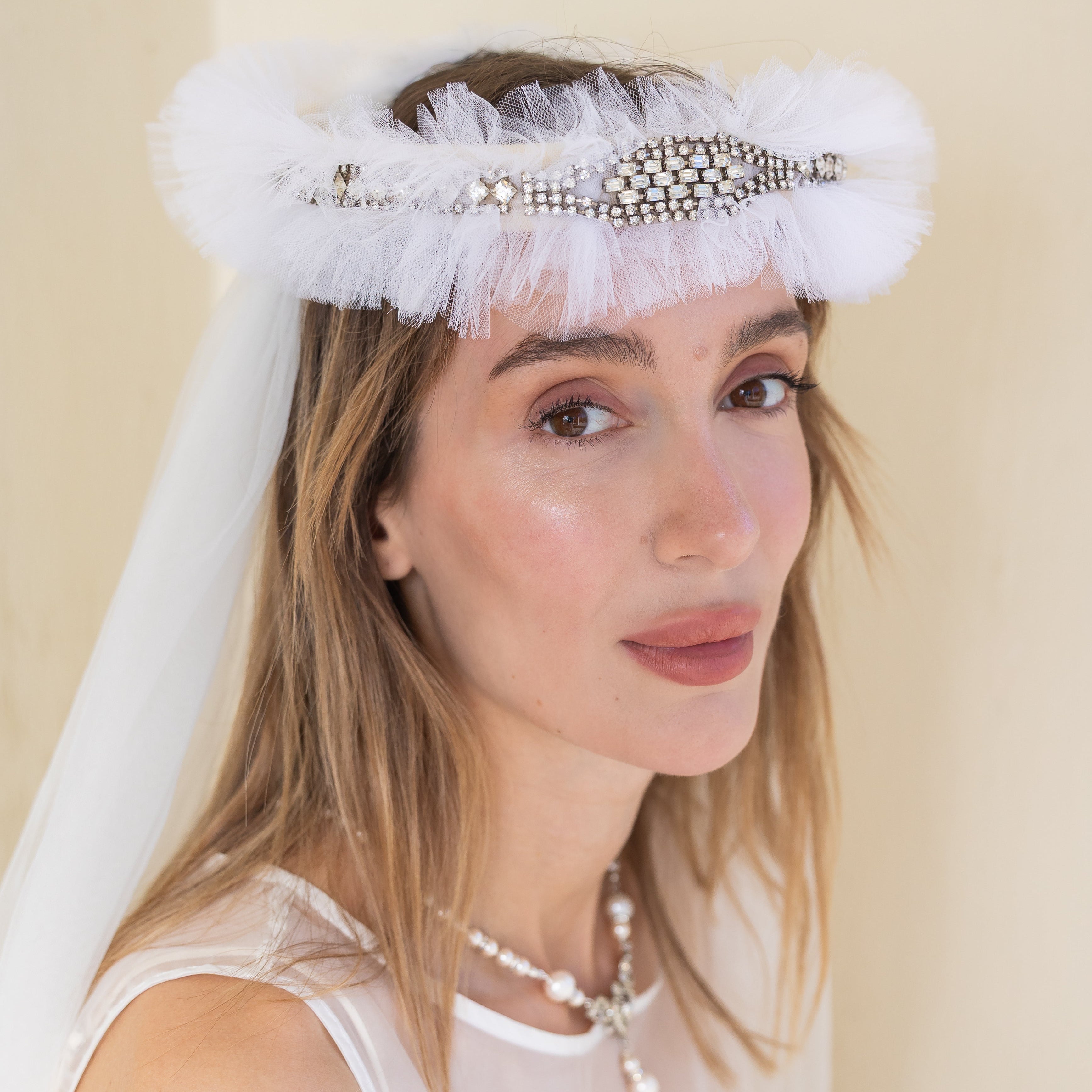 A dreamlike halo of soft white tulle and vintage-style rhinestones, crafted to bring ethereal sparkle to any bridal look. Lightweight, romantic, and beautifully dramatic—this piece frames the face with angelic softness and photographs like a dream.