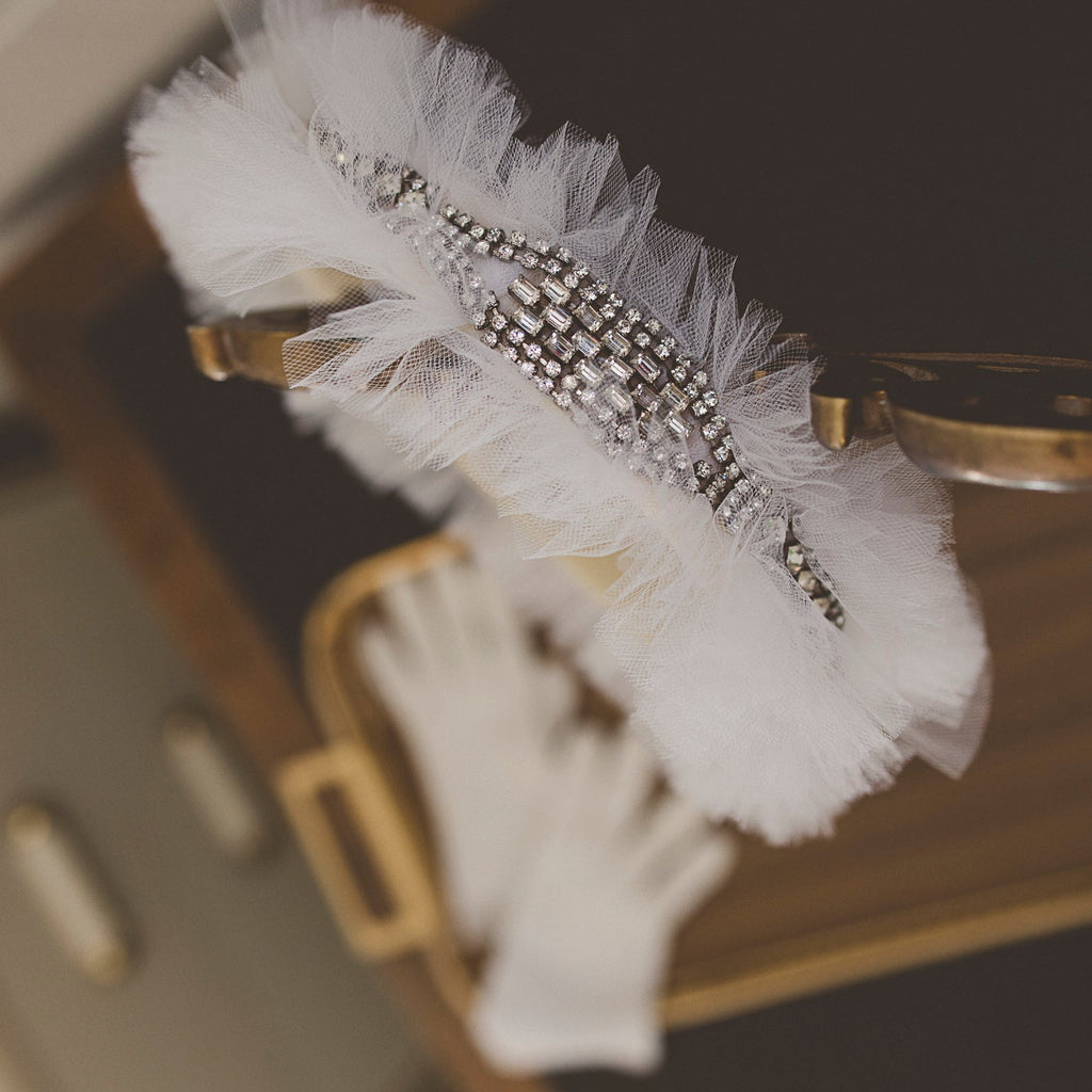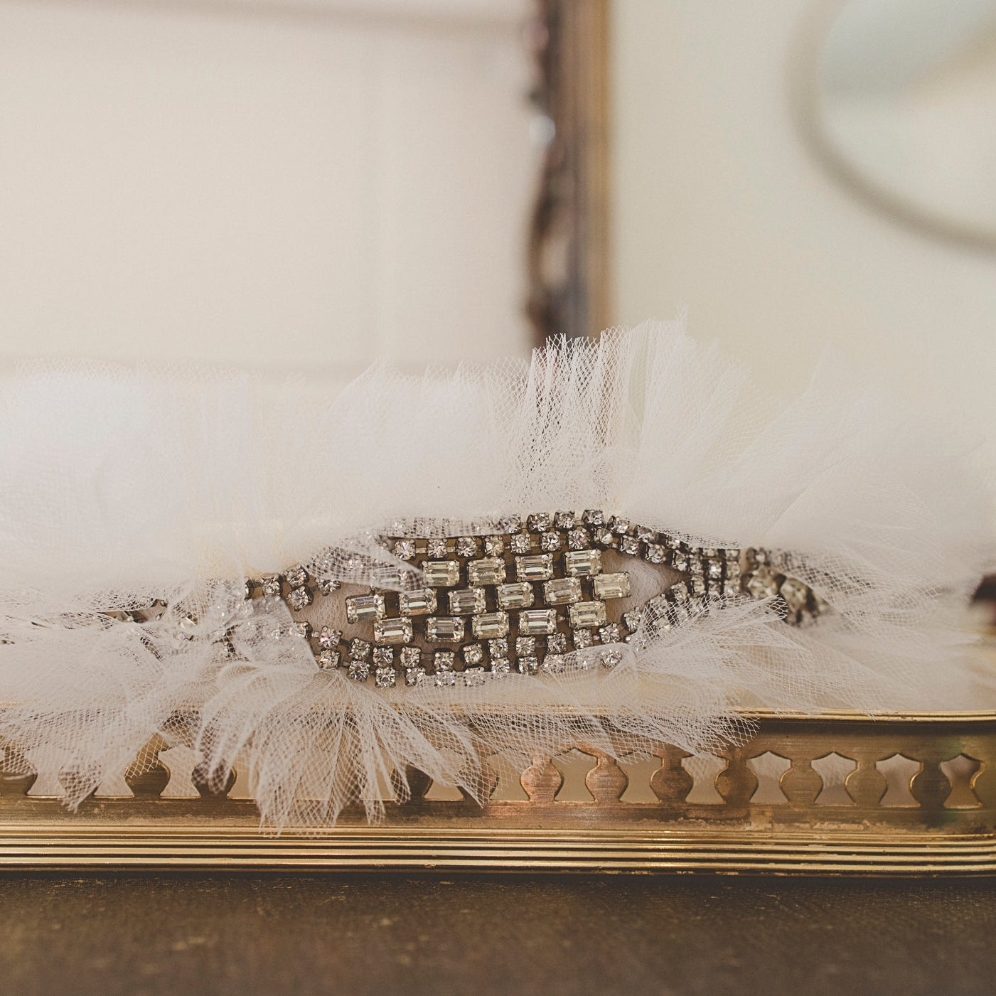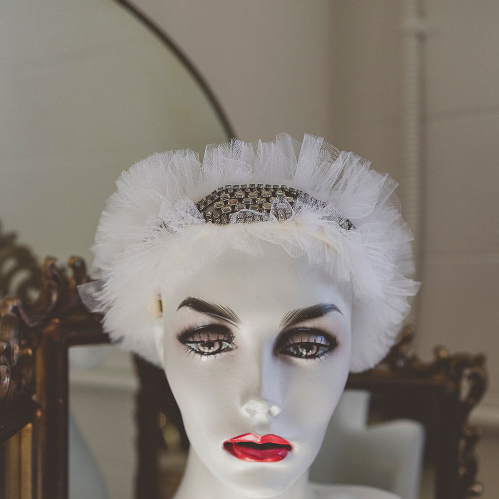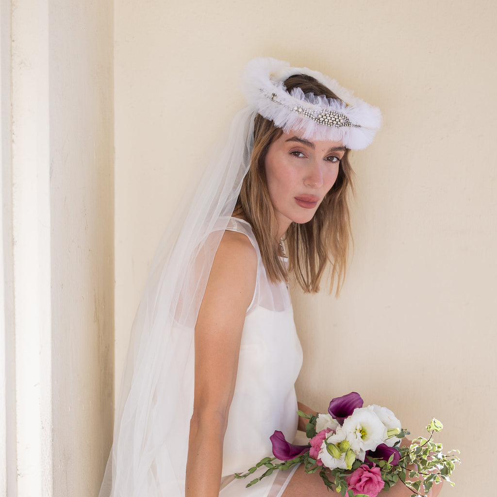 A dreamlike halo of soft white tulle and vintage-style rhinestones, crafted to bring ethereal sparkle to any bridal look. Lightweight, romantic, and beautifully dramatic—this piece frames the face with angelic softness and photographs like a dream.