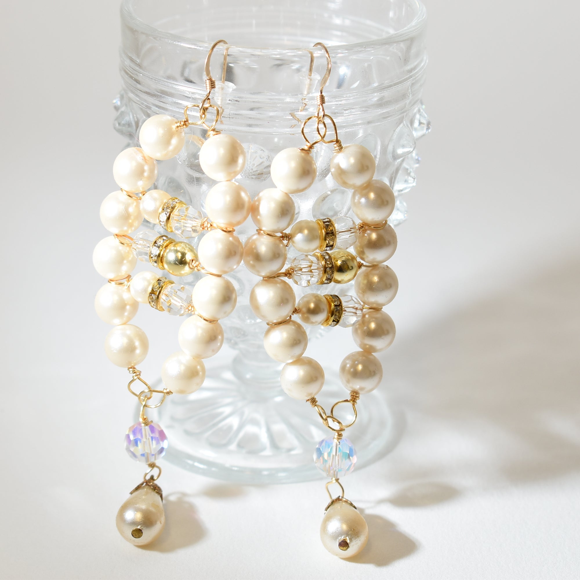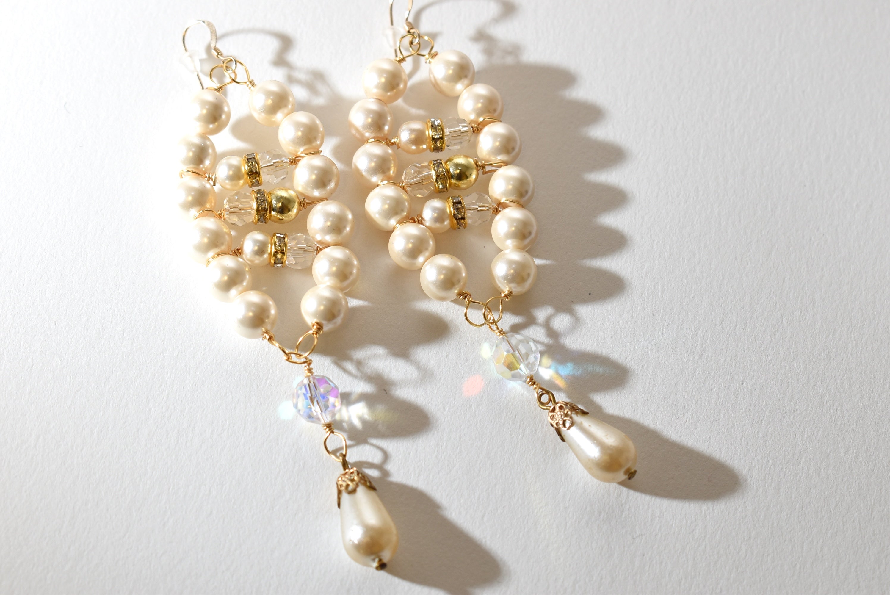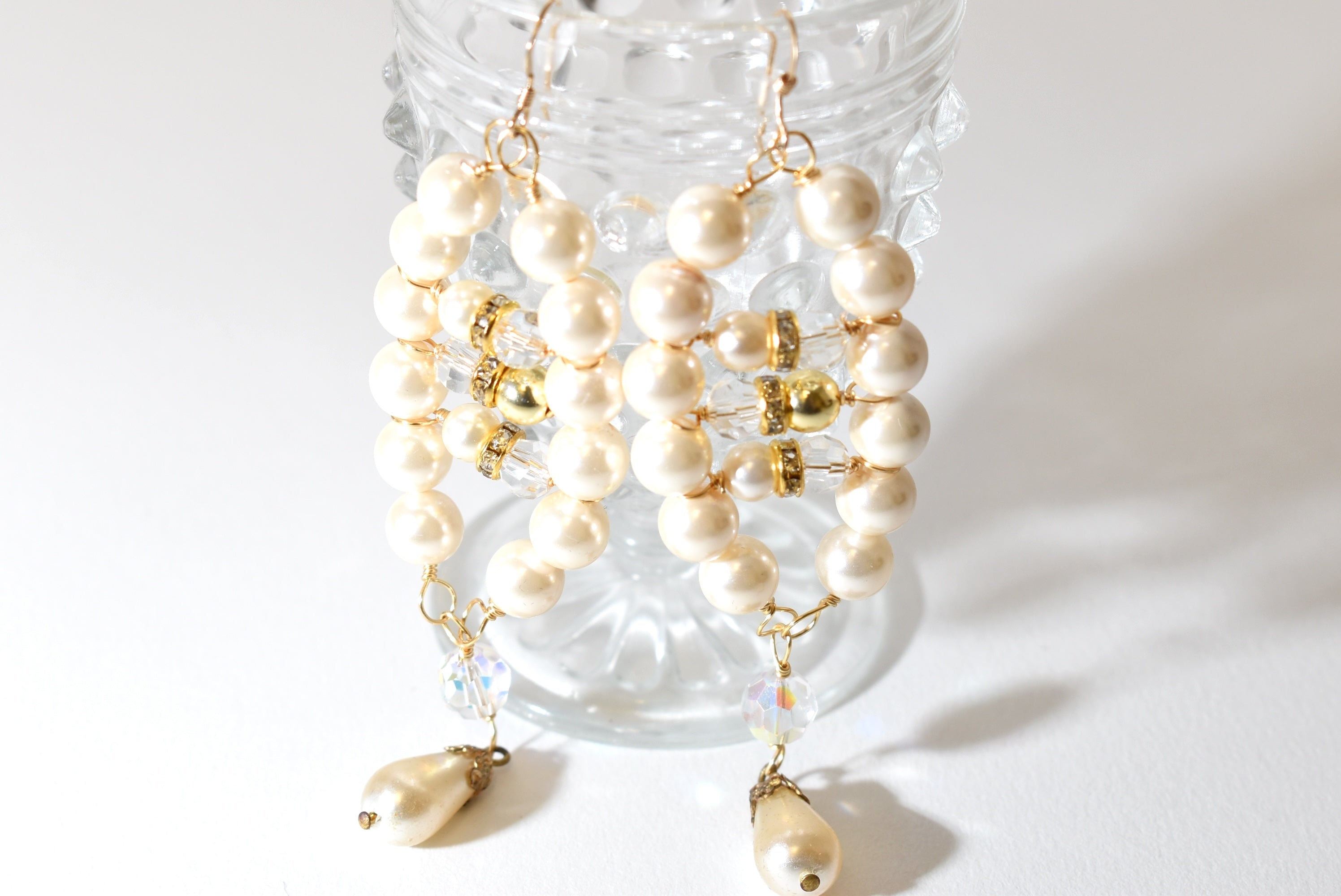Elegant and eye-catching, these handmade pearl chandelier earrings are designed to add timeless glamour to any outfit. Featuring lustrous ivory glass pearls accented with sparkling crystal beads and rhinestone spacers, each earring is finished with a teardrop pearl dangle for graceful movement. Perfect for brides or bridesmaids, or anyone looking to elevate their style.