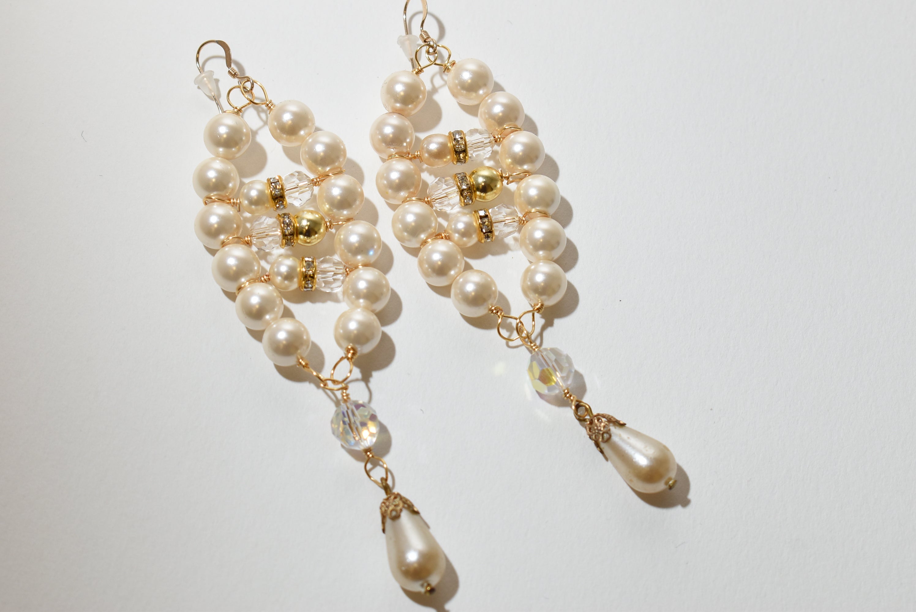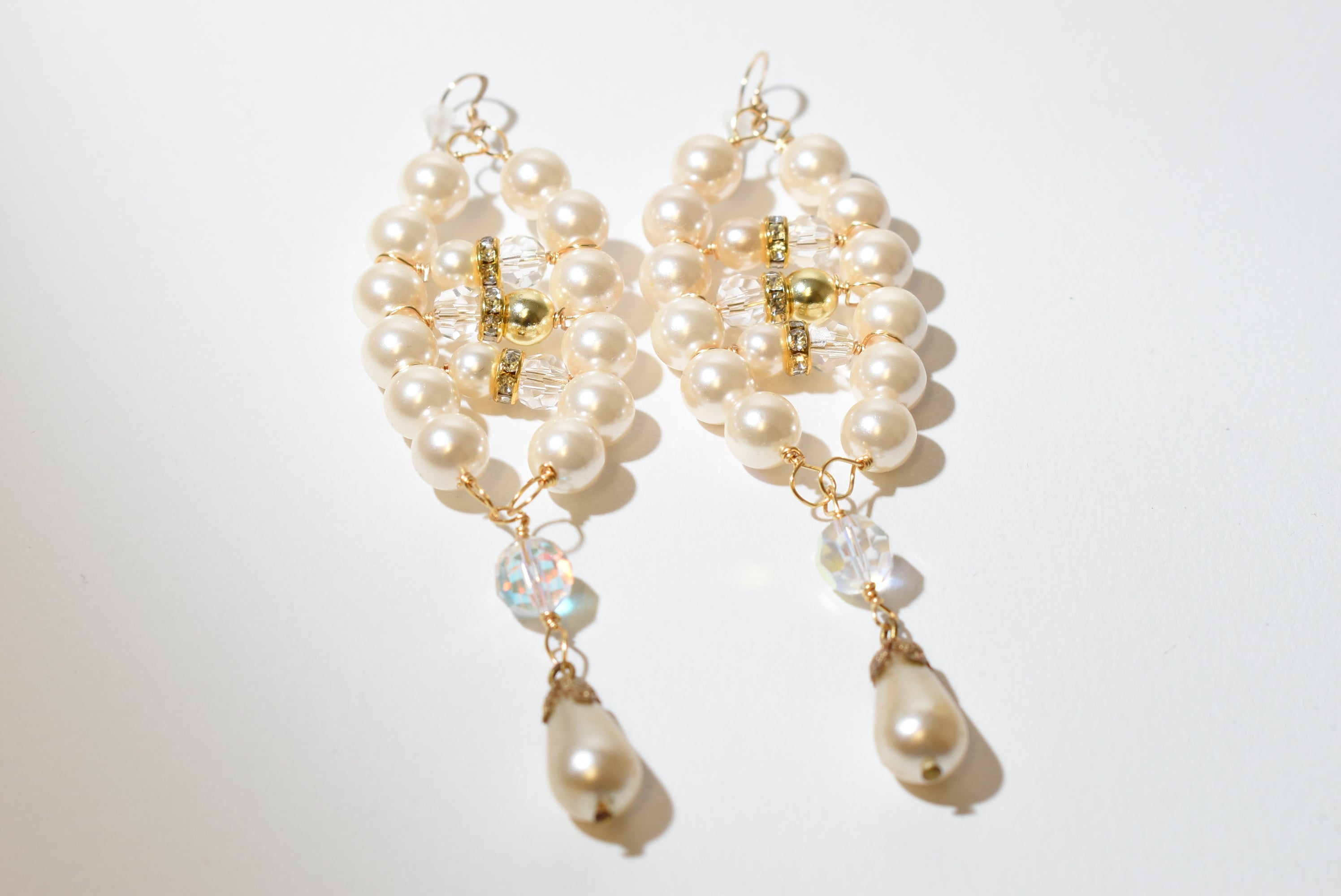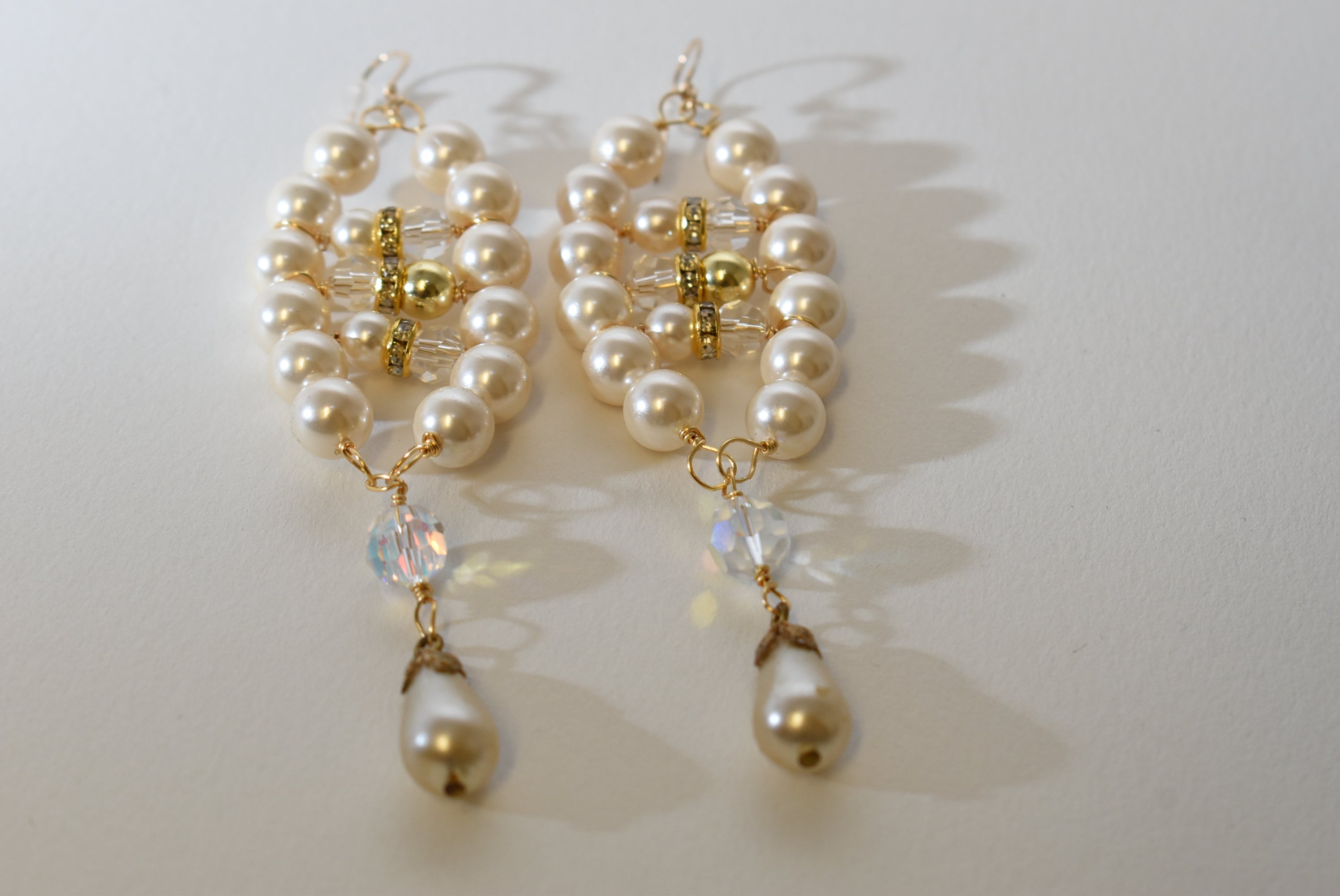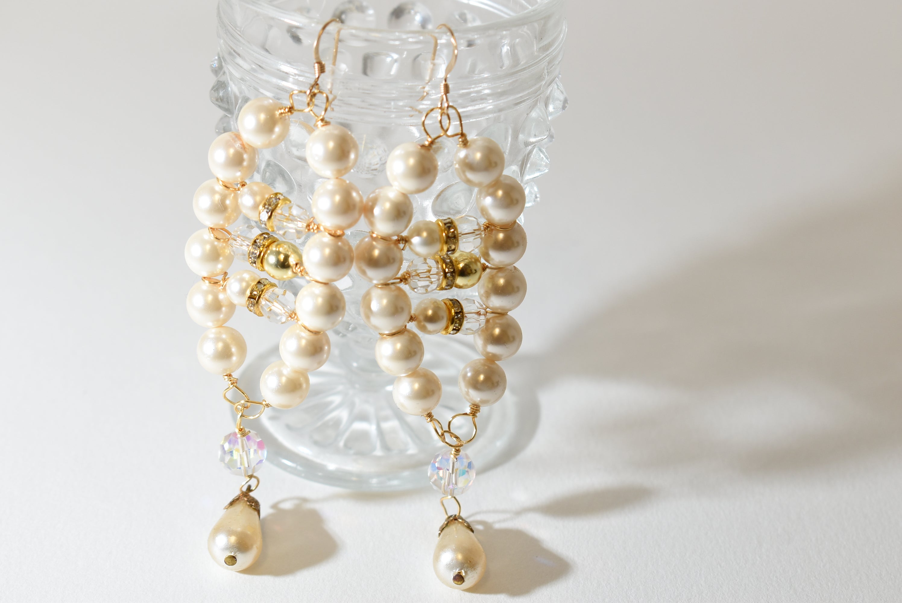 Elegant and eye-catching, these handmade pearl chandelier earrings are designed to add timeless glamour to any outfit. Featuring lustrous ivory glass pearls accented with sparkling crystal beads and rhinestone spacers, each earring is finished with a teardrop pearl dangle for graceful movement. Perfect for brides or bridesmaids, or anyone looking to elevate their style.
