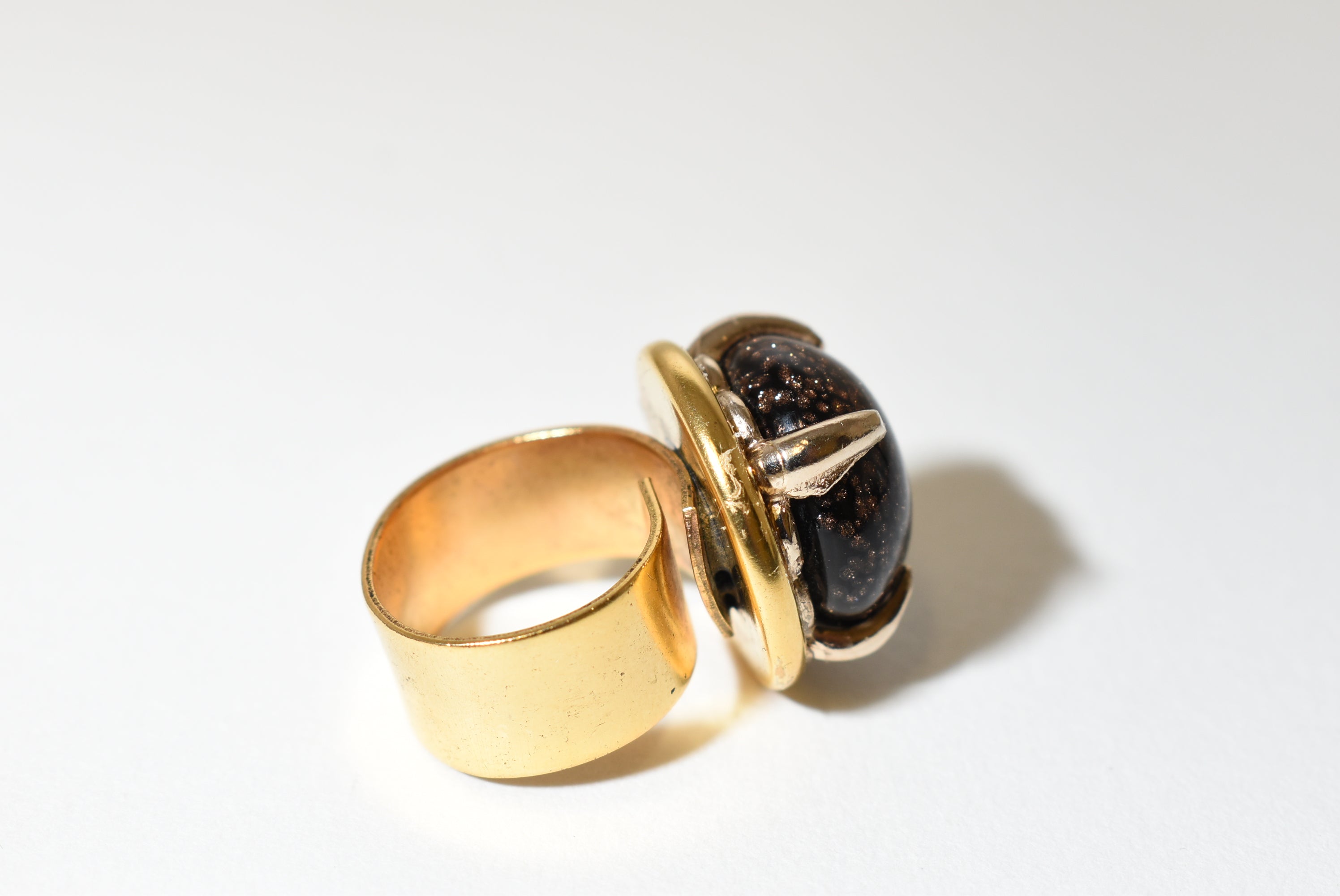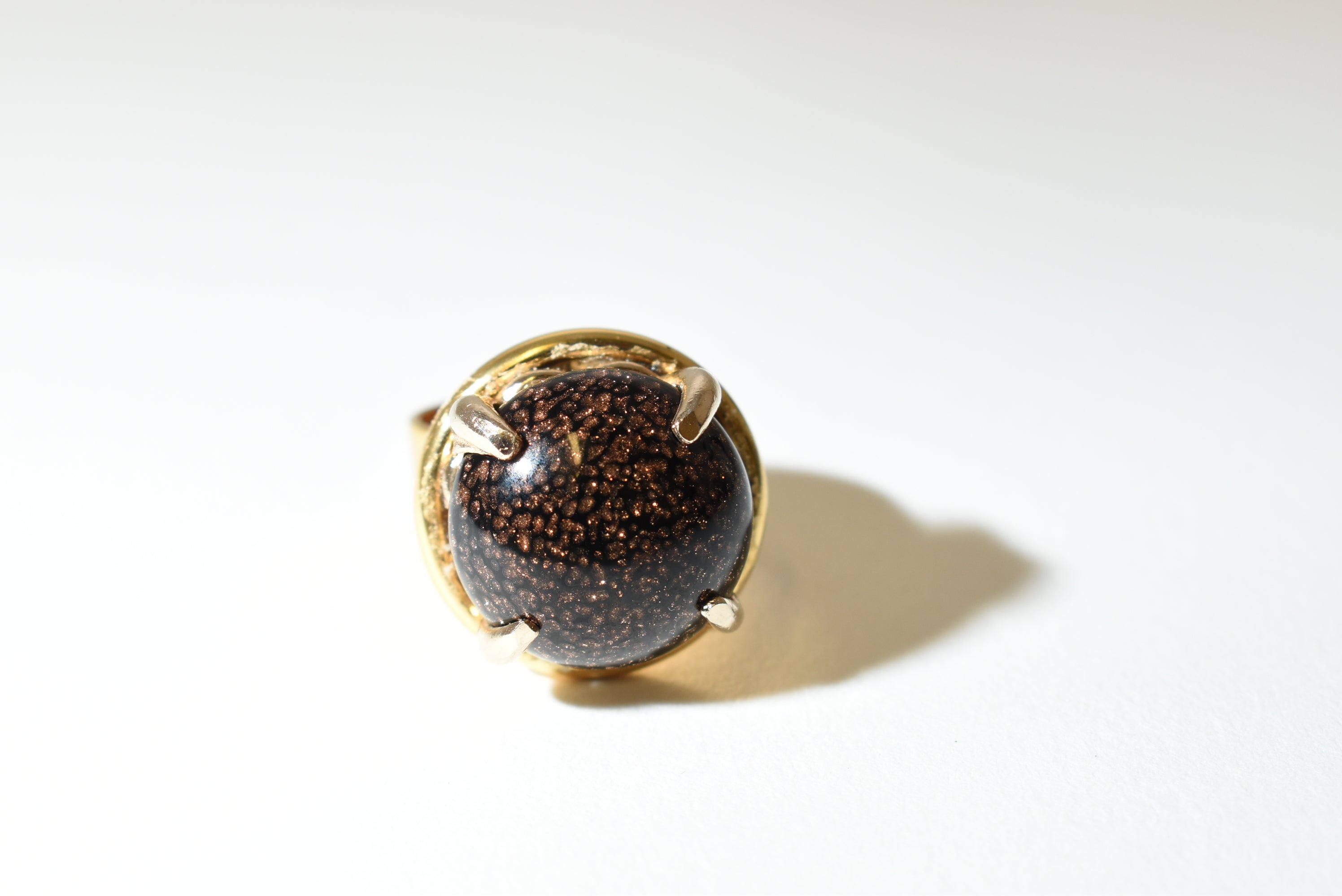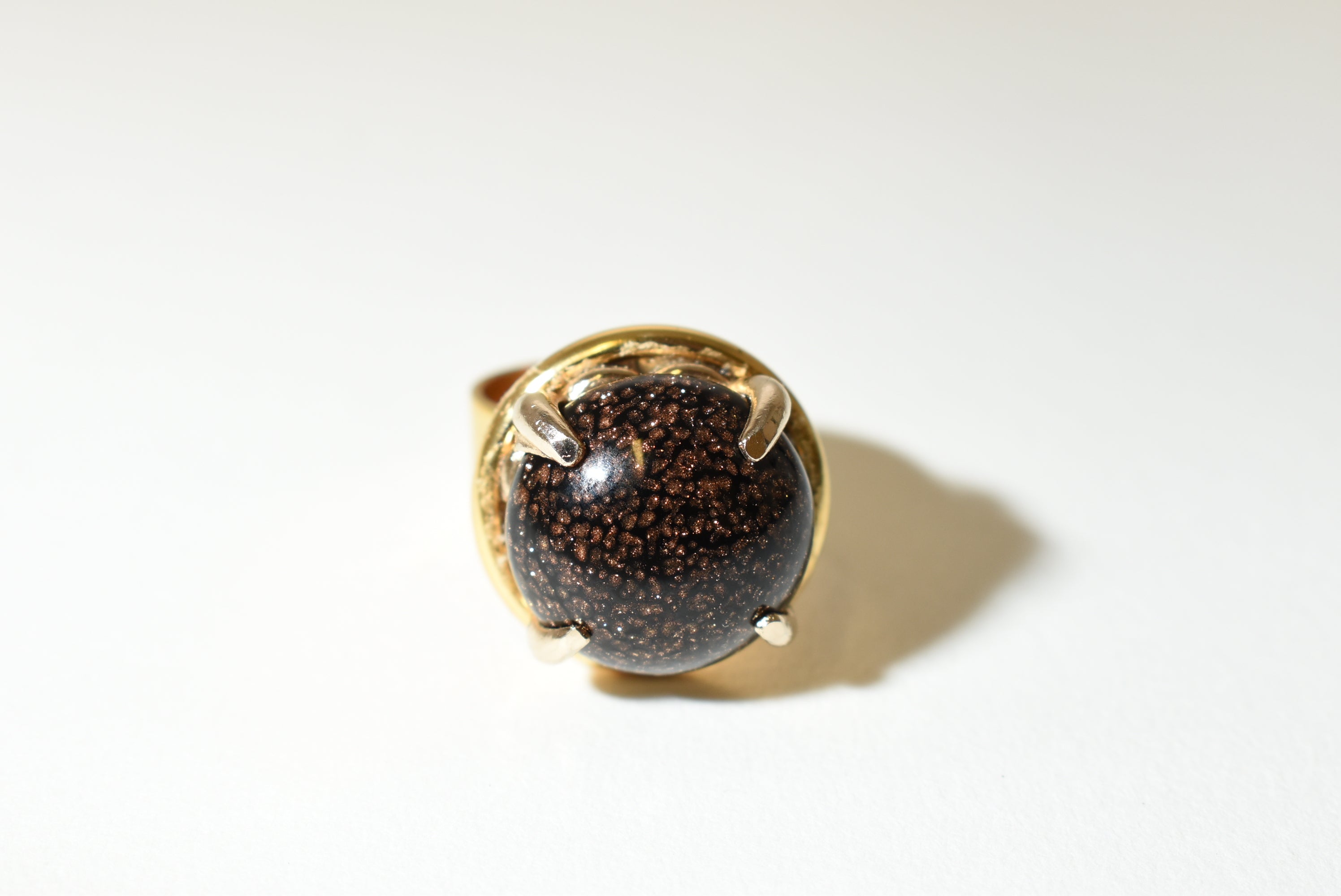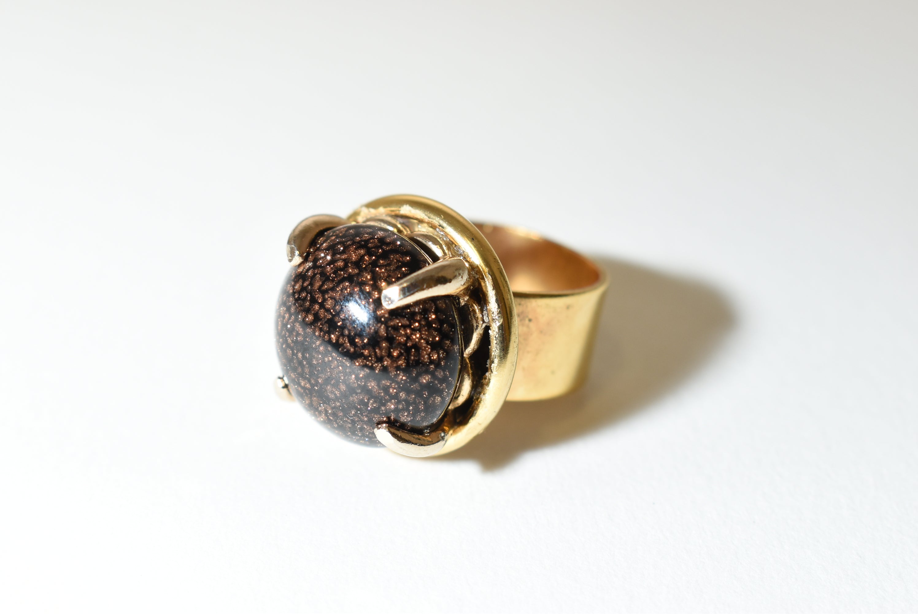 Bring celestial sparkle to your look with this adjustable bold cocktail ring, featuring a shimmering Goldstone cabochon set in a striking gold-time band. The rich dark brown stone glitters with copper flecks, catching the light like a starry night sky.