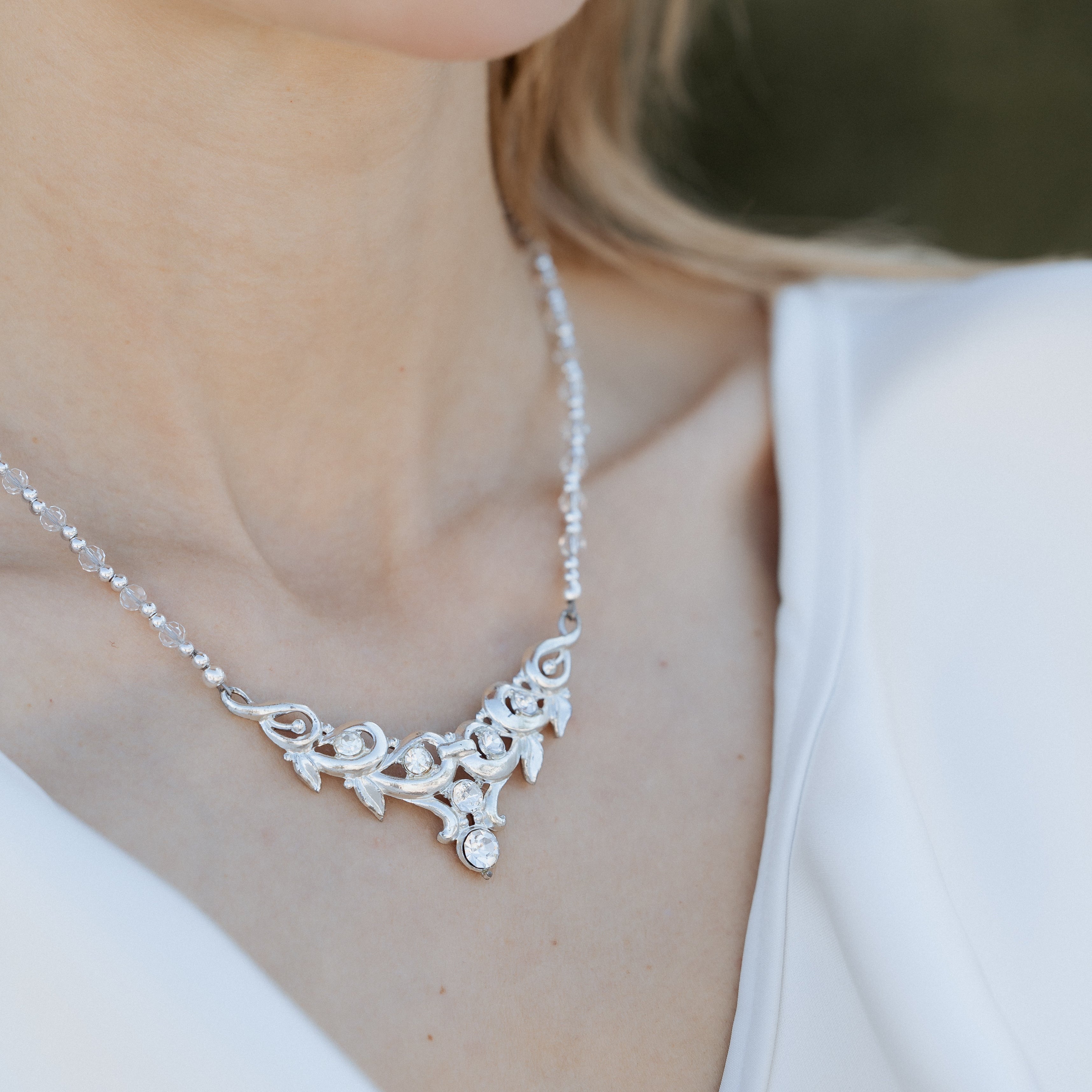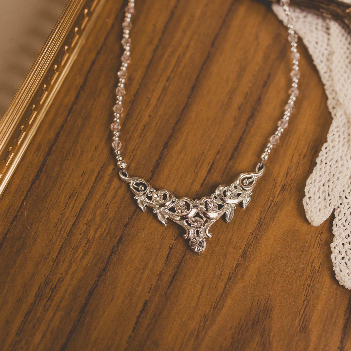 A romantic, heirloom-inspired beaded necklace. This piece has been lovingly made in our Santa Cruz studio using up cycled vintage elements. One of a kind and ready for your next party or special event.