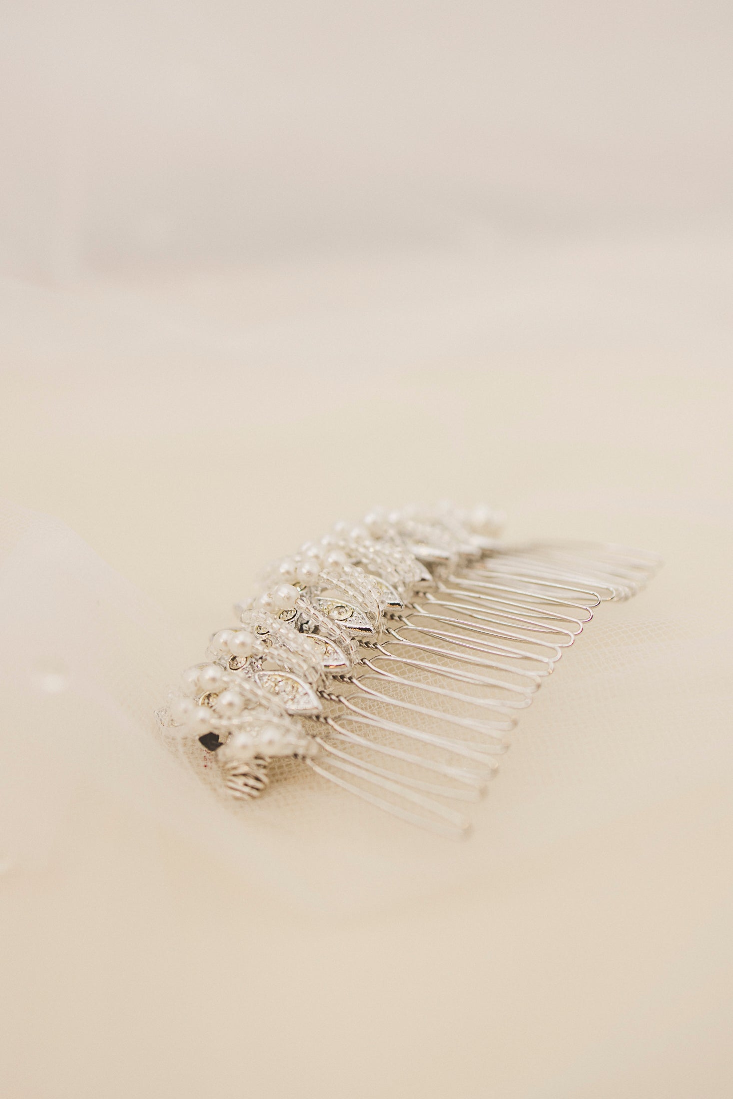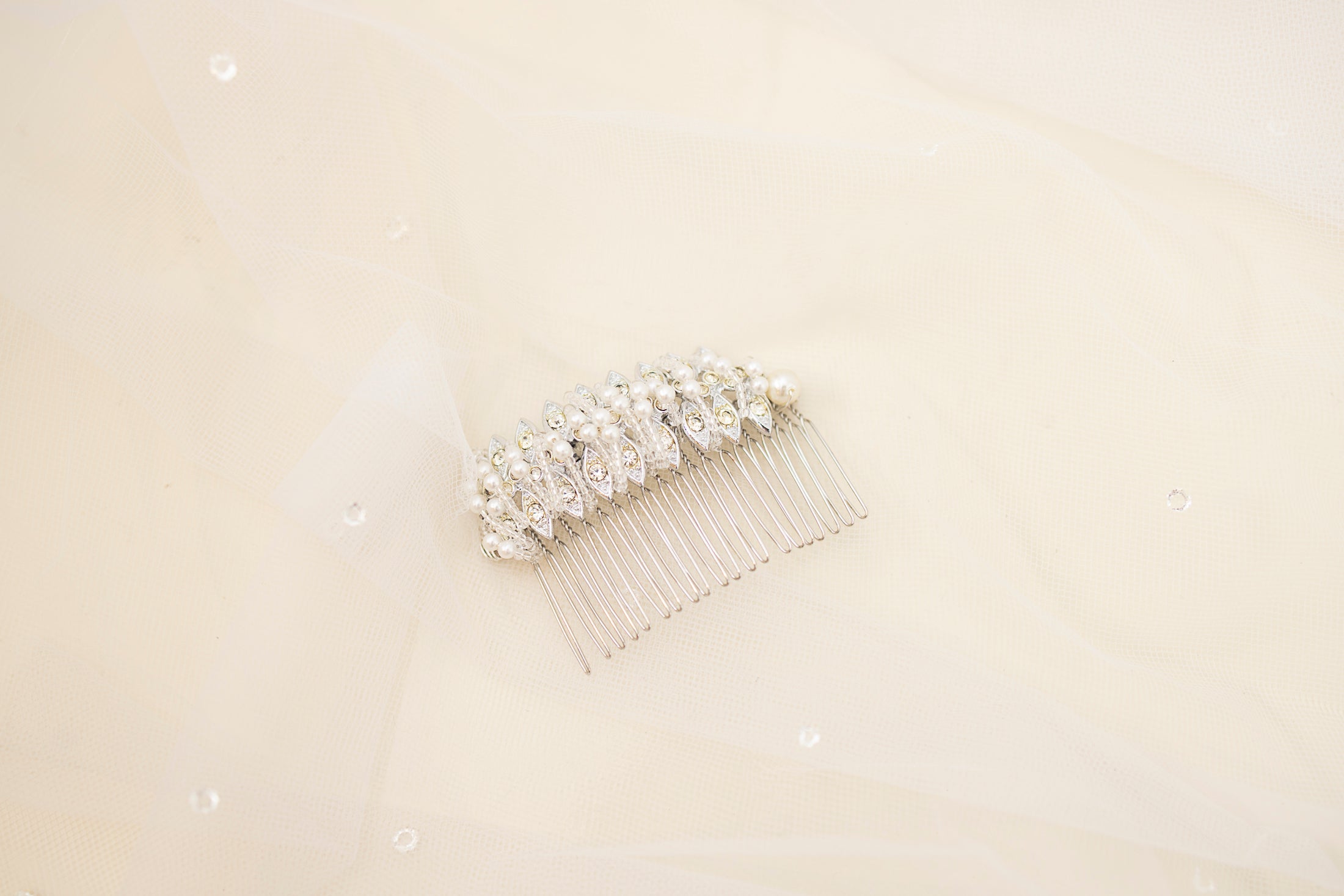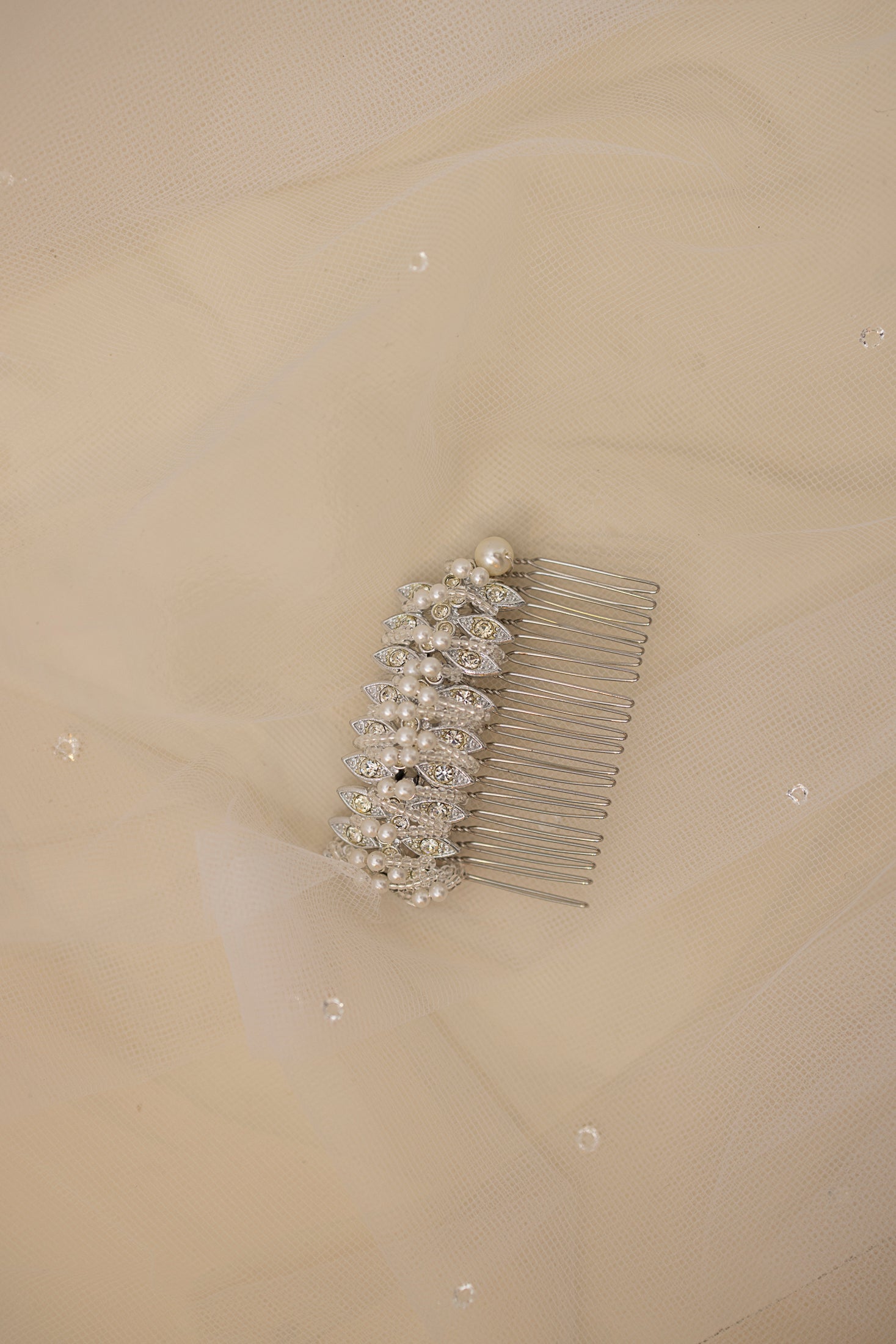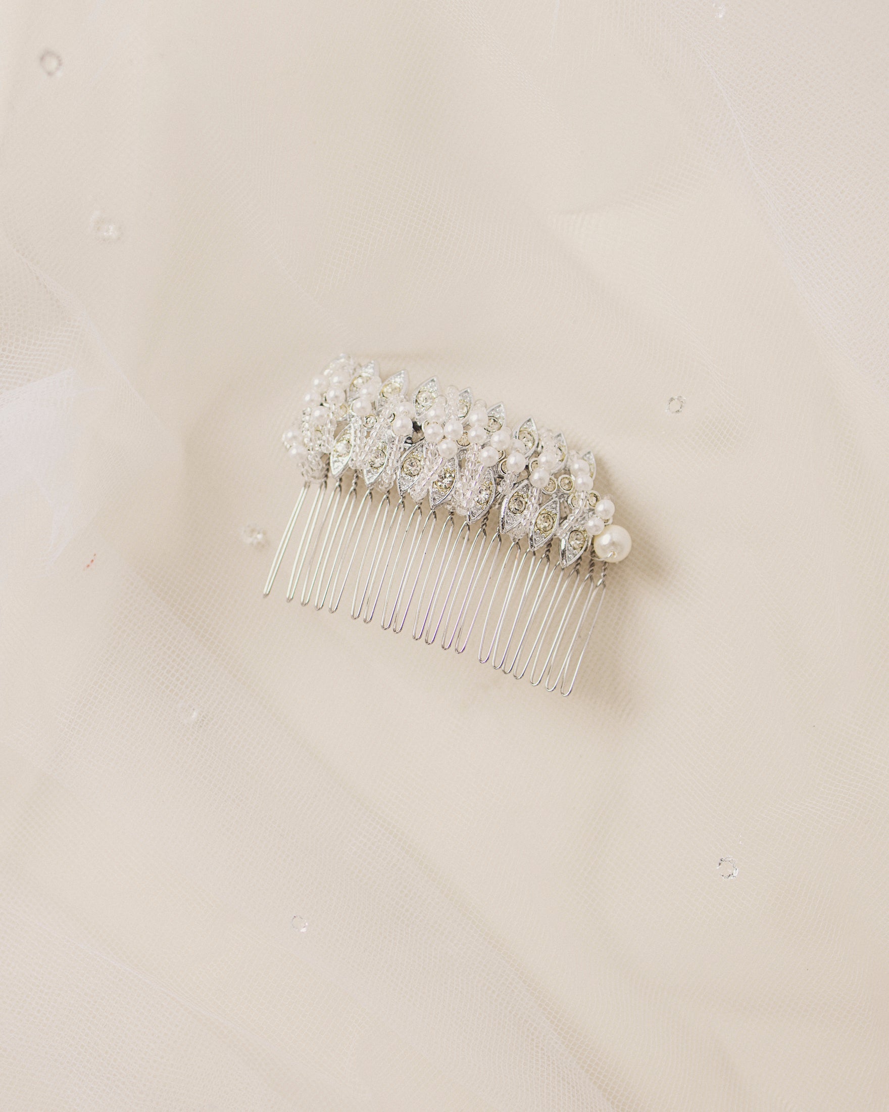 Each detail is carefully arranged to catch the light beautifully, creating a soft shimmer that complements bridal updos, low chignons, half-up styles, or loose romantic waves. The silver-toned comb slides securely into the hair, offering both comfort and lasting hold from ceremony to celebration.